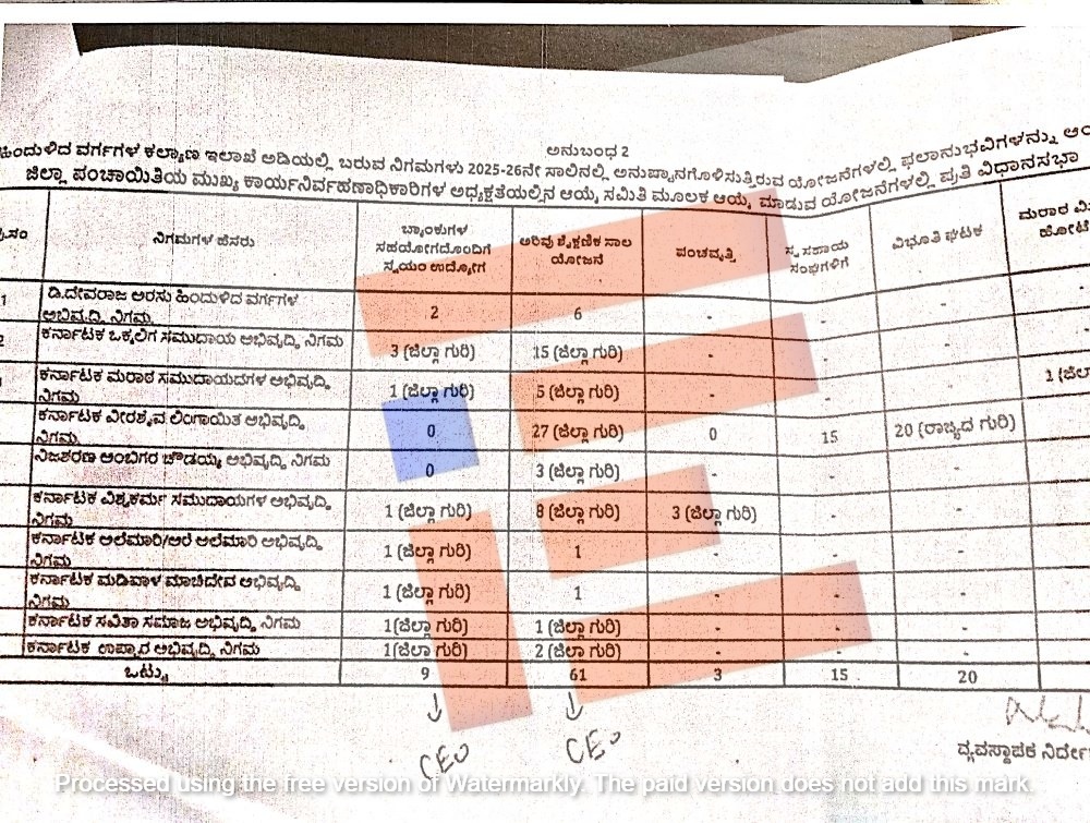 ಕರ್ನಾಟಕ ಮಡಿವಾಳ ಮಾಚಿದೇವ ಅಭಿವೃದ್ಧಿ ನಿಗಮದಲ್ಲಿ ಸ್ವಯಂ ಉದ್ಯೋಗದಡಿಯಲ್ಲಿ 4, ಗಂಗಾ ಕಲ್ಯಾಣ ಯೋಜನೆಯಡಿಯಲ್ಲಿ 1 ಸ್ವಾವಲಂಬಿ ಸಾರಥಿ ಯೋಜನೆಯಡಿಯಲ್ಲಿ ಒಬ್ಬ ಫಲಾನುಭವಿ ಆಯ್ಕೆ ಮಾಡಬೇಕಿತ್ತು. ಕರ್ನಾಟಕ ಸವಿತಾ ಸಮಾಜದಲ್ಲಿ ಸ್ವಯಂ ಉದ್ಯೋಗ ಯೋಜನೆಗೆ 1, ಗಂಗಾ ಕಲ್ಯಾಣ ಯೋಜನೆಗೆ 3, ಸ್ವಾವಲಂಬಿ ಸಾರಥಿ ಯೋಜನೆಗೆ ಒಬ್ಬ ಫಲಾನುಭವಿಯನ್ನು ಆಯ್ಕೆ ಮಾಡಬೇಕಿತ್ತು. ಕರ್ನಾಟಕ ಉಪ್ಪಾರ ಅಭಿವೃದ್ದಿ ನಿಗಮದಲ್ಲಿ ಸ್ವಯಂ ಉದ್ಯೋಗ ಯೋಜನೆಯಡಿಯಲ್ಲಿ 2, ಗಂಗಾ ಕಲ್ಯಾಣ ಯೋಜನೆಗೆ 2, ಸ್ವಾವಲಂಬಿ ಸಾರಥಿ ಯೋಜನೆಗೆ ಒಬ್ಬ ಫಲಾನುಭವಿ ಆಯ್ಕೆ ಮಾಡಲು ಗುರಿ ನಿಗದಿಪಡಿಸಿತ್ತು.