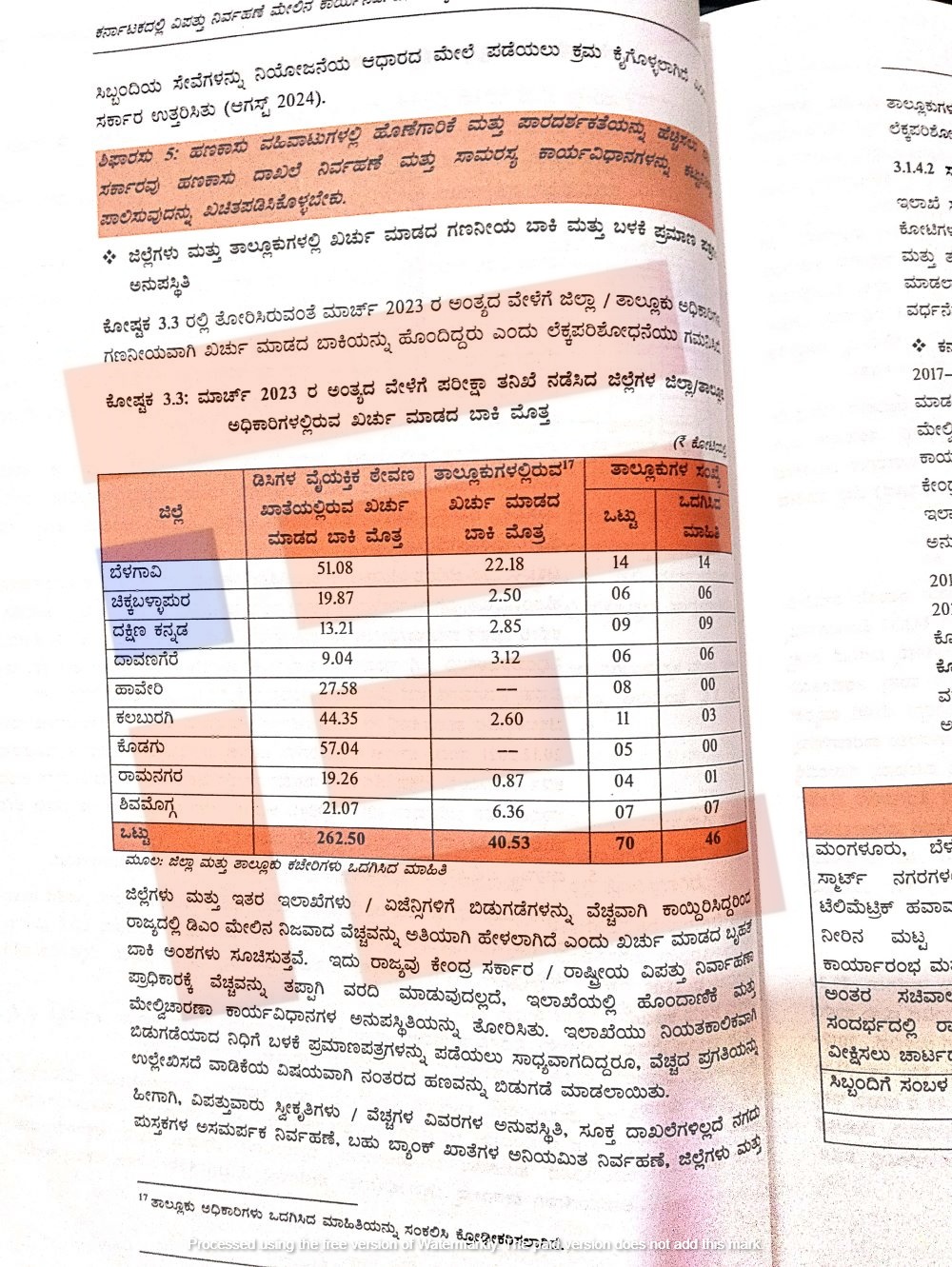 ಒಟ್ಟಾರೆ ಜಿಲ್ಲಾಧಿಕಾರಿಗಳ ಪಿ ಡಿ ಖಾತೆಗಳಲ್ಲಿ 262.50 ಕೋಟಿ ಮತ್ತು ತಾಲೂಕು ಕಚೇರಿಗಳಲ್ಲಿ 40.53 ಕೋಟಿ ರು ಸೇರಿ ಒಟ್ಟಾರೆ 303.03 ಕೋಟಿ ರು ಖರ್ಚಾಗದೇ ಬಾಕಿ ಉಳಿದಿತ್ತು ಎಂದು ಸಿಎಜಿ ವರದಿಯಿಂದ ತಿಳಿದು ಬಂದಿದೆ.