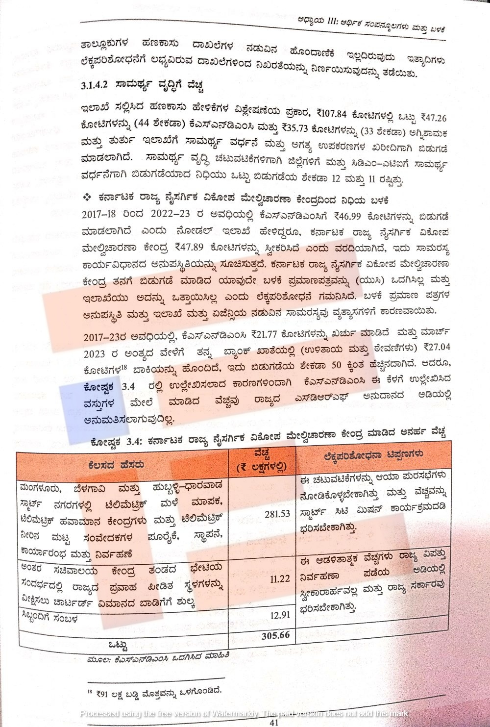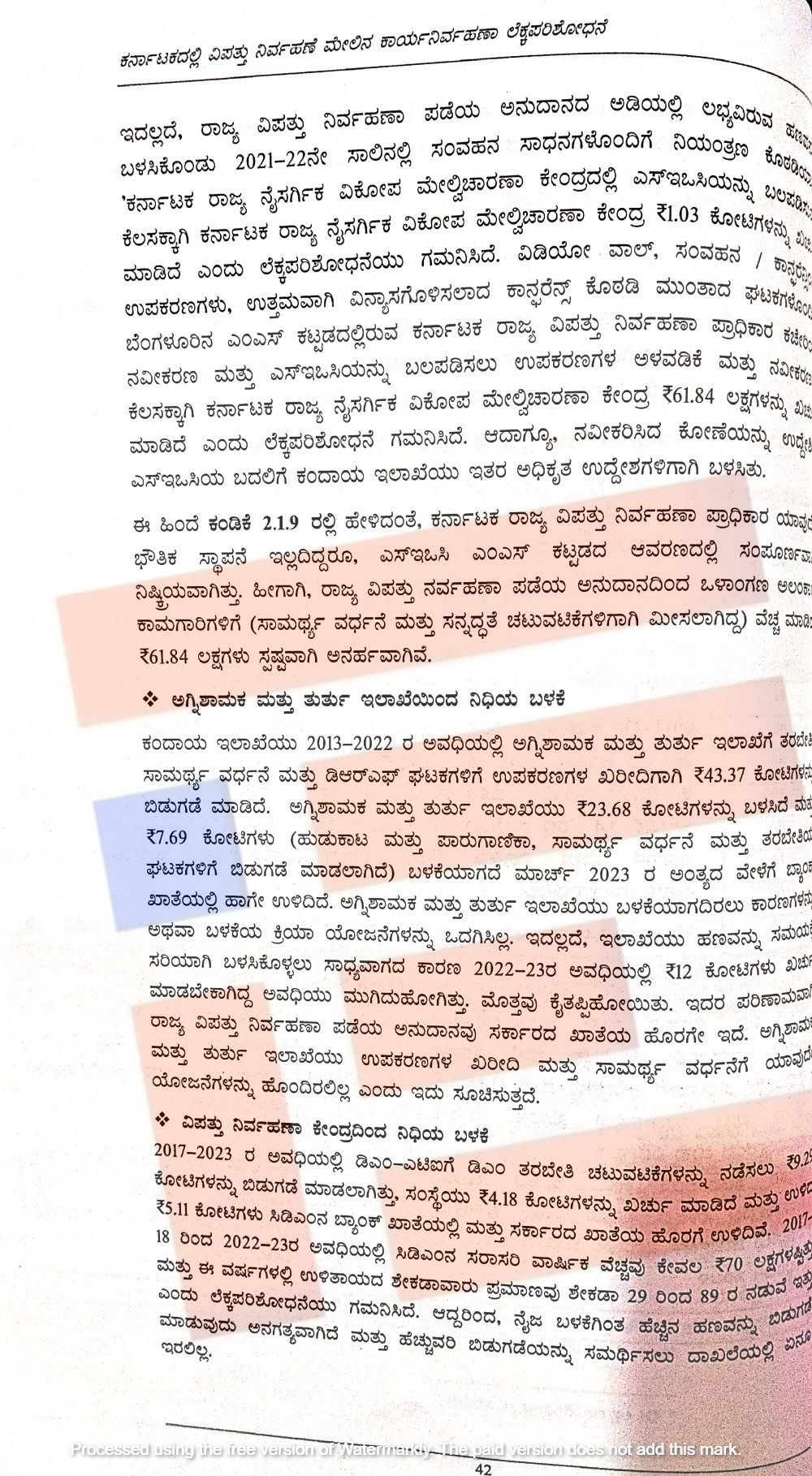 ಈ ಹಣದಲ್ಲಿ ವಿಡಿಯೋ ವಾಲ್, ಸಂವಹನ, ಸಭಾಂಗಣ ಉಪಕರಣಗಳು, ಬೆಂಗಳೂರಿನ ಬಹುಮಹಡಿ ಕಟ್ಟಡದಲ್ಲಿರುವ ಕರ್ನಾಟಕ ರಾಜ್ಯ ವಿಪತ್ತು ನಿರ್ವಹಣಾ ಪ್ರಾಧಿಕಾರ ಕಚೇರಿಯ ನವೀಕರಣ, ಎಸ್ಇಒಸಿ ಬಲಪಡಿಸಲು ಉಪಕರಣಗಳ ಅಳವಡಿಕೆ ಮತ್ತು ನವೀಕರಣಕ್ಕಾಗಿ 61.84 ಲಕ್ಷ ರುಗ.ಳನ್ನು ಖರ್ಚು ಮಾಡಿದೆ. ಮತ್ತು ನವೀಕರಿಸಿದ್ದ ಕೋಣೆಯನ್ನು ಕಂದಾಯ ಇಲಾಖೆಯು ಅನ್ಯ ಉದ್ದೇಶಗಳಿಗೆ ಬಳಸಿರುವುದನ್ನು ಲೆಕ್ಕ ಪರಿಶೋಧನೆಯು ಗಮನಿಸಿದೆ.