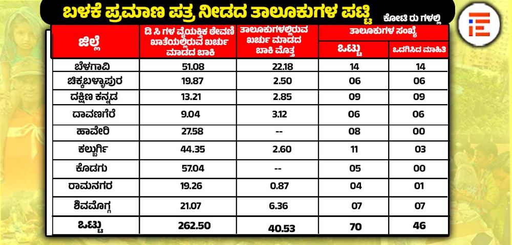 ಬೆಳಗಾವಿ ಜಿಲ್ಲೆಯ ಜಿಲ್ಲಾಧಿಕಾರಿಗಳ ವೈಯಕ್ತಿಕ ಠೇವಣಿ ಖಾತೆಯಲ್ಲಿ 51.08 ಕೋಟಿ, ತಾಲೂಕು ಕಚೇರಿಗಳಲ್ಲಿ 22.18 ಕೋಟಿ ರು ಸೇರಿ 72.26 ಕೋಟಿಯಷ್ಟು ಬಾಕಿ ಉಳಿದಿತ್ತು. ಚಿಕ್ಕಬಳ್ಳಾಪುರದಲ್ಲಿ ಜಿಲ್ಲಾಧಿಕಾರಿ ಮತ್ತು ತಾಲೂಕು ಕಚೇರಿಗಳಲ್ಲಿ ಒಟ್ಟಾರೆ 22.37 ಕೋಟಿ, ದಕ್ಷಿಣ ಕನ್ನಡದಲ್ಲಿ ಜಿಲ್ಲಾಧಿಕಾರಿ, ತಾಲೂಕು ಕಚೇರಿಗಳಲ್ಲಿ 16.06 ಕೋಟಿ, ದಾವಣಗೆರೆ ಜಿಲ್ಲೆಯಲ್ಲಿ ಜಿಲ್ಲಾಧಿಕಾರಿ, ತಾಲೂಕು ಕಚೇರಿಗಳಲ್ಲಿ 12.16 ಕೋಟಿ, ಹಾವೇರಿ ಜಿಲ್ಲೆಯಲ್ಲಿ ಜಿಲ್ಲಾಧಿಕಾರಿ ಹೆಸರಿನಲ್ಲಿನ ಪಿ ಡಿ ಖಾತೆಯಲ್ಲಿ 27.58 ಕೋಟಿ ಬಾಕಿ ಉಳಿದಿತ್ತು.
