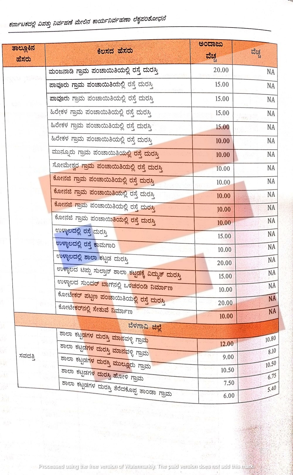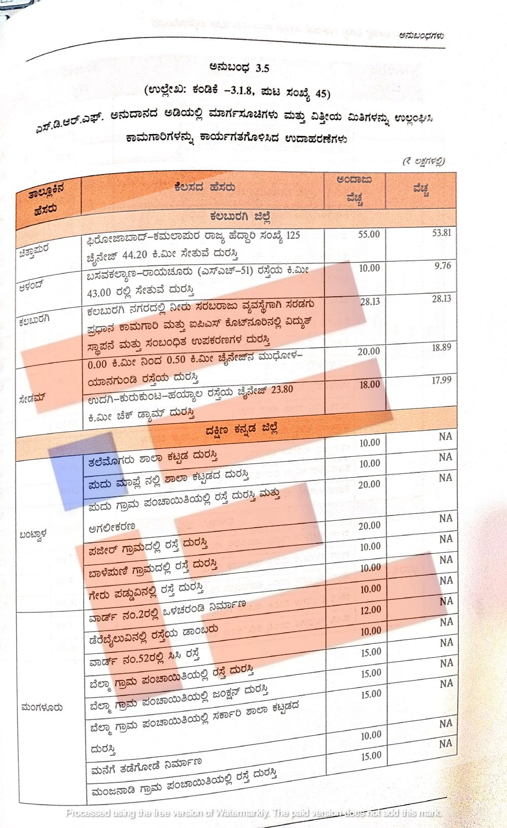 ದಕ್ಷಿಣ ಕನ್ನಡ ಜಿಲ್ಲೆಯ ಬಂಟ್ವಾಳ ಮತ್ತು ಮಂಗಳೂರಿನಲ್ಲಿಯೂ ಸಹ ವಿತ್ತೀಯ ಮಿತಿಗಳನ್ನು ಉಲ್ಲಂಘಿಸಿ ಕಾಮಗಾರಿಗಳನ್ನು ಕಾರ್ಯಗತಗೊಳಿಸಲಾಗಿತ್ತು. ಬಂಟ್ವಾಳದ ತಲೆಮೊಗರು ಶಾಲಾ ಕಟ್ಟಡ ದುರಸ್ತಿಗೆ 10.00 ಲಕ್ಷ ರು, ಪುದು ಮಾಪ್ಲೆನಲ್ಲಿ ಶಾಲಾ ಕಟ್ಟಡ ದುರಸ್ತಿಗೆ 10.00 ಲಕ್ಷ ರು., ಪುದು ಗ್ರಾಮ ಪಂಚಾಯ್ತಿಯಲ್ಲಿ ರಸ್ತೆ ದುರಸ್ತಿ ಮತ್ತು ಶಾಲಾ ಕಟ್ಟಡ ದುರಸ್ತಿಗೆಂದು 20 ಲಕ್ಷ ರು, ಪಜೀರ್ ಗ್ರಾಮದಲ್ಲಿ ರಸ್ತೆ ದುರಸ್ತಿಗಾಗಿ 20 ಲಕ್ಷ, ಬಾಳಿಪುಣಿ ಗ್ರಾಮದಲ್ಲಿ ರಸ್ತೆ ದುರಸ್ತಿಗೆ 10 ಲಕ್ಷ, ಗೇರು ಪಡ್ಡುವಿನಲ್ಲಿ ರಸ್ತೆ ದುರಸ್ತಿಗೆ 10 ಲಕ್ಷ ರು ಖರ್ಚು ಮಾಡಲಾಗಿದೆ.