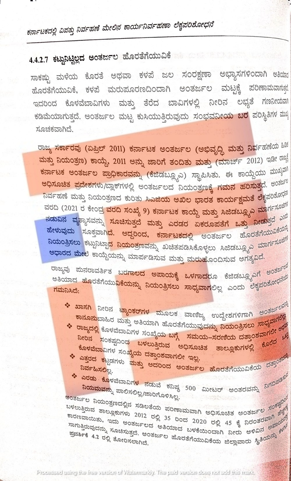 ರಾಜ್ಯವು ಪುನರಾವರ್ತಿತ ಬರಗಾಲದ ಅಪಾಯಕ್ಕೆ ಒಳಗಾಗಿದೆ. ಆದರೂ ಅಂತರ್ಜಲ ಅತಿಯಾದ ಹೊರತೆಗೆಯುವಿಕೆಯನ್ನು ನಿಯಂತ್ರಿಸಲು ಸಾಧ್ಯವಾಗಲಿಲ್ಲ ಎಂಬ ಸಂಗತಿಯನ್ನು ಲೆಕ್ಕ ಪರಿಶೋಧನೆಯು ಗಮನಿಸಿದೆ. ಖಾಸಗಿ ನೀರಿನ ಟ್ಯಾಂಕರ್ಗಳ ಮೂಲಕ ವಾಣಿಜ್ಯ ಉದ್ದೇಶಗಳಿಗಾಗಿ ಅಂತರ್ಜಲವನ್ನು ಕಾನೂನುಬಾಹಿರ ಮತ್ತು ಅತಿಯಾಗಿ ಹೊರತೆಗೆಯುವಿಕೆಯನ್ನು ನಿಯಂತ್ರಿಸಲು ಸಾಧ್ಯವಾಗಲಿಲ್ಲ. ರಾಜ್ಯದಲ್ಲಿ ಕೊಳವೆ ಬಾವಿಗಳ ಸಂಖ್ಯೆಯ ಬಗ್ಗೆ ಸಮಯ, ಸರಣಿಯ ದತ್ತಾಂಶಗಳಾಗಲೀ ಅಥವಾ ನೀರಿನ ಸಂಕಷ್ಟದಿಂದ ಬಳಲುತ್ತಿರುವ ಅಧಿಸೂಚಿತ ತಾಲೂಕುಗಳಲ್ಲಿ ಕೊರೆದ ಒಟ್ಟು ಕೊಳವೆ ಬಾವಿಗಳ ಸಂಖ್ಯೆಯ ದತ್ತಾಂಶವೂ ಇಲ್ಲ ಎಂದು ಸಿಎಜಿಯು ಪತ್ತೆ ಹಚ್ಚಿದೆ.