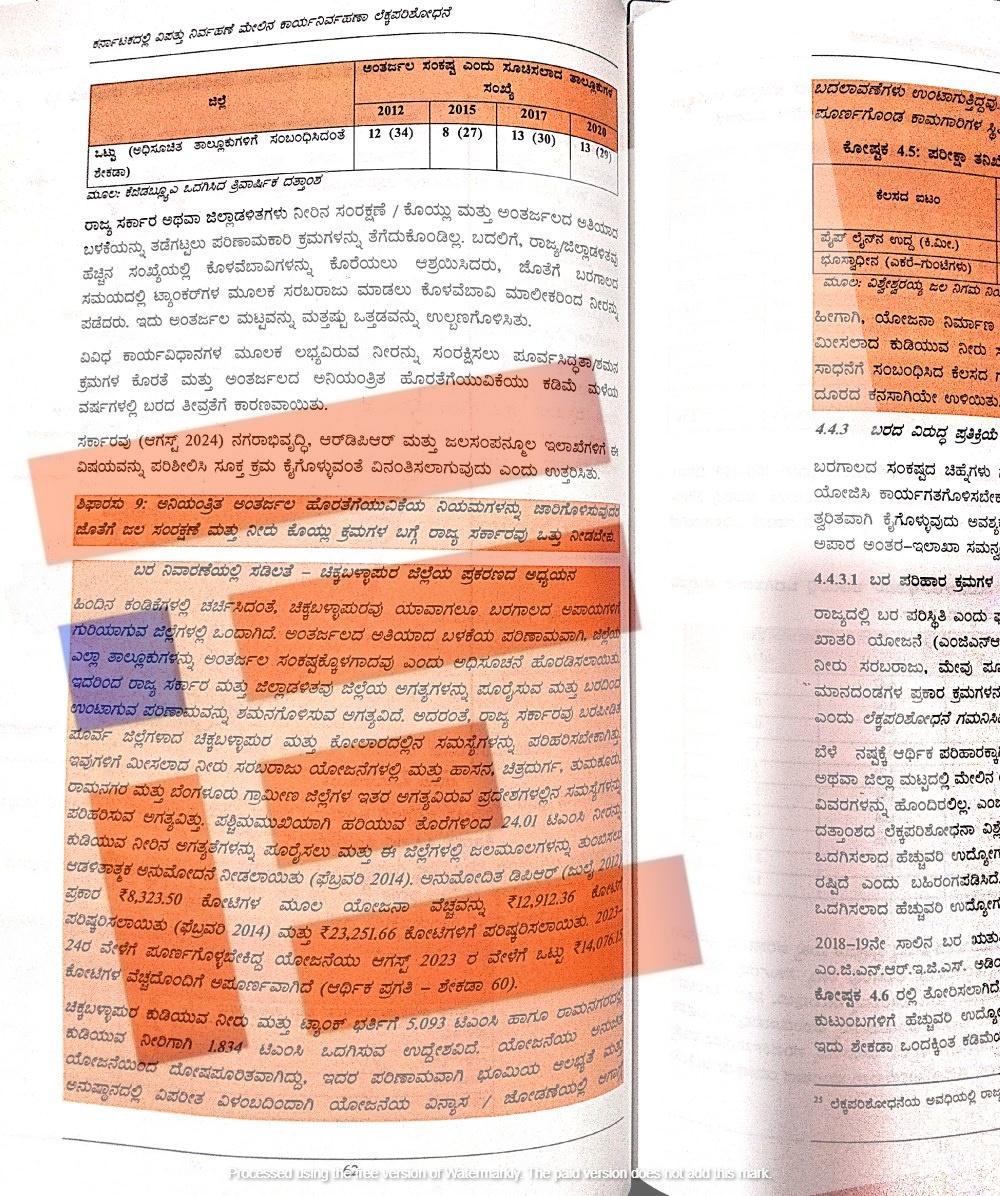 2025ರ ಡಿಸೆಂಬರ್ನಲ್ಲಿ ಬೆಳಗಾವಿಯಲ್ಲಿ ನಡೆದ ವಿಧಾನಮಂಡಲ ಅಧಿವೇಶನದಲ್ಲಿ ಮಂಡನೆಯಾಗಿರುವ ಸಿಎಜಿ ವರದಿಯು, ಬರ ನಿವಾರಣೆಯಲ್ಲಿ ಕುಡಿಯುವ ನೀರು ಸರಬರಾಜು ಯೋಜನೆಗಳನ್ನು ಪರಿಶೀಲನೆ ಮಾಡಿದೆ. ಈ ವರದಿ ಕುರಿತು ಸಚಿವ ಕೃಷ್ಣಬೈರೇಗೌಡ ಅವರು ಅಧಿಕಾರಿಗಳೊಂದಿಗೆ ಚರ್ಚಿಸಿದ್ದಾರೆ ಎಂದು ಗೊತ್ತಾಗಿದೆ.