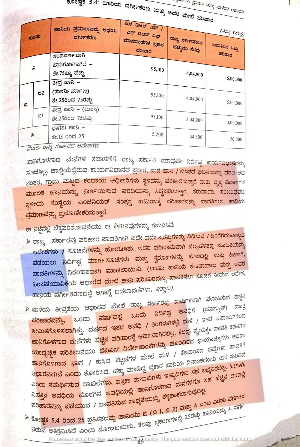 ಮಳೆಯಿಂದಾಗಿ ಸಂಭವಿಸಿದ ಹಾನಿಗೆ ಸೂಕ್ತ ಪರಿಹಾರ ನೀಡಲು ರಾಜ್ಯ ಸರ್ಕಾರವು ಹಾನಿಯ ಪ್ರಮಾಣವನ್ನು ಆಧರಿಸಿ ವರ್ಗೀಕರಣ ಮಾಡಿತ್ತು. ಸಂಪೂರ್ಣವಾಗಿ ಹಾನಿಗೊಳಗಾದ ಅಂದರೇ ಶೇ. 75ಕ್ಕೂ ಹೆಚ್ಚು ಹಾನಿಯಾಗಿರುವ ಮನೆಗಳಿಗೆ ಎಸ್ಡಿಆರ್ಎಫ್ ಮಾನದಂಡಗಳ ಪ್ರಕಾರ 95,100 ರು, ರಾಜ್ಯ ಸರ್ಕಾರದಿಂದ ಹೆಚ್ಚುವರಿಯಾಗಿ 4,04,900 ರು. ಸೇರಿ ಒಟ್ಟಾರೆ 5,00,000 ರು ಪರಿಹಾರ ಪಾವತಿಸಿದೆ.