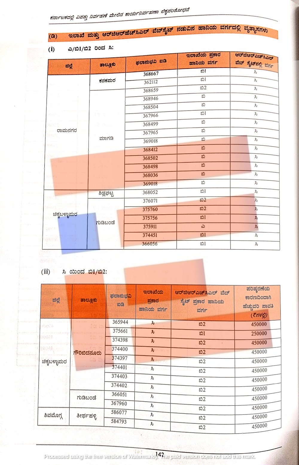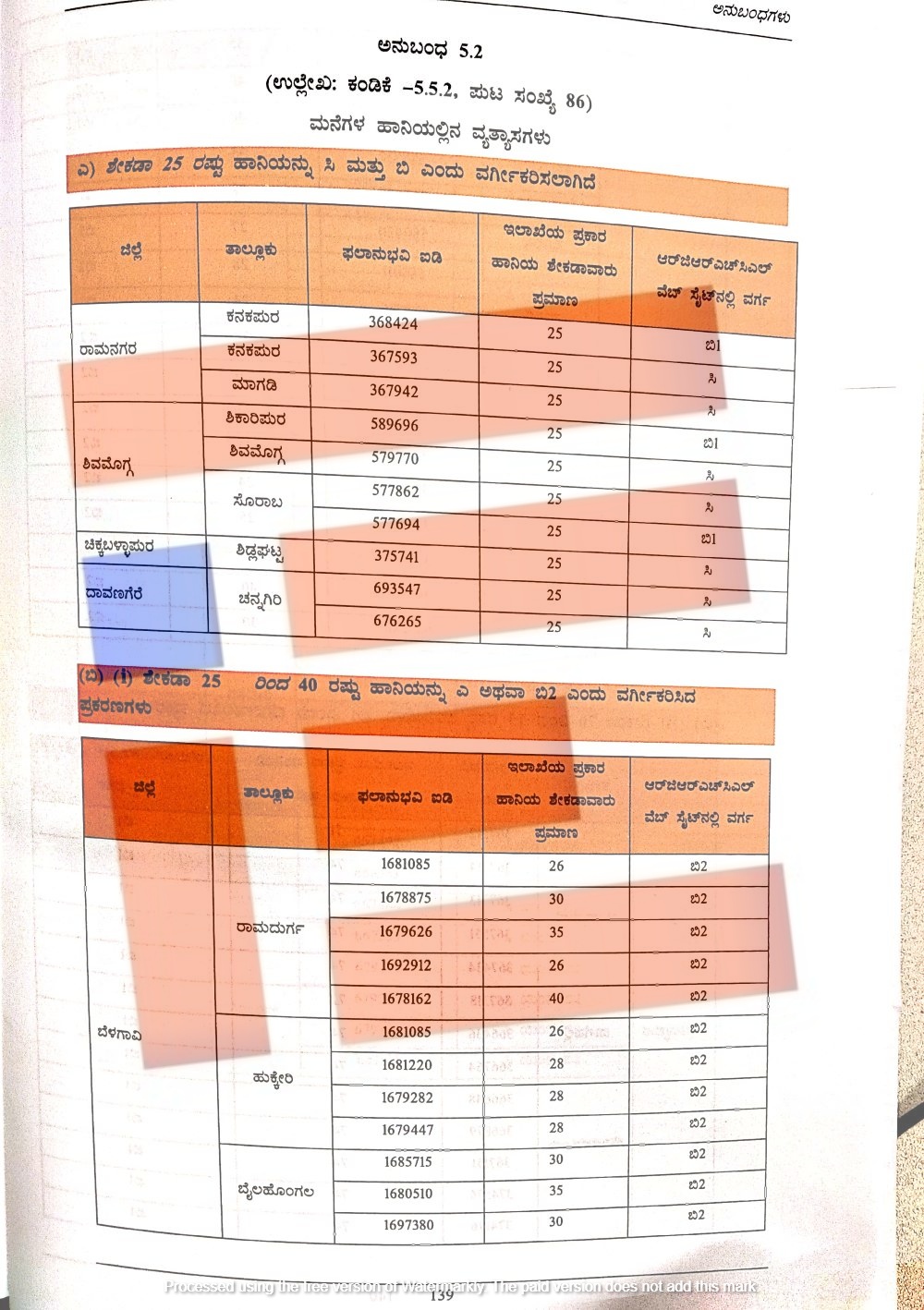 ಚಿಕ್ಕಬಳ್ಳಾಪುರದ ಗೌರಿಬಿದನೂರಿನ ಫಲಾನುಭವಿಗಳಿಗೆ ( ಐ ಡಿ 374398, 374400, 374397, 374401, 374403, 374402) ಶೇ. 25,24,25,23ರಷ್ಟು ಹಾನಿಯಾಗಿದ್ದರೂ ಸಹ ಆರ್ಜಿಆರ್ಎಚ್ಸಿಎಲ್ ನ ವೆಬ್ಸೈಟ್ನಲ್ಲಿ ಬಿ 2 ಎಂದು ವರ್ಗೀಕರಿಸಲಾಗಿದೆ. ರಾಮನಗರದ ಮಾಗಡಿ ಫಲಾನುಭವಿಗೆ ( ಐ ಡಿ 367882) ಶೆ. 40ರಷ್ಟು ಹಾನಿ, ದಾವಣಗೆರೆಯ ನ್ಯಾಮತಿ ಫಲಾನುಭವಿಗೆ ( ಐ ಡಿ 680248) ಶೇ. 30ರಷ್ಟು ಹಾನಿಯಾಗಿದೆ ಎಂದು ಇಲಾಖೆಯು ಹೇಳಿದ್ದರೇ ಆರ್ಜಿಆರ್ಎಚ್ಸಿಎಲ್ ನ ವೆಬ್ಸೈಟ್ನಲ್ಲಿ ಬಿ 2 ಎಂದು ವರ್ಗೀಕರಿಸಿದೆ.
