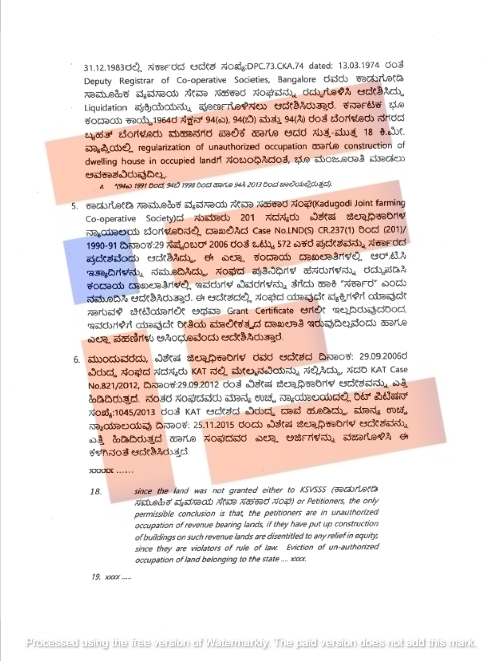 ಬೆಂಗಳೂರು; ಬೆಂಗಳೂರು ನಗರದ ದಿನ್ನೂರು ಕಾಲೋನಿ ಮತ್ತು ಗೋಪಾಲಕೃಷ್ಣ ಬಡಾವಣೆ (ಗುಲ್ಜಾರ್ ಖಾನ್ ಬಡಾವಣೆ) ಹಾಗೂ ಇತರೆ ಖಾಸಗಿ ವ್ಯಕ್ತಿಗಳು, ಪಟ್ಟಭದ್ರ ಹಿತಾಸಕ್ತಿಗಳು ಅನೇಕ ಜನರಿಗೆ ಬೆಂಗಳೂರು ಪೂರ್ವ ತಾಲೂಕಿನ ಬಿದರಹಳ್ಳಿ ಹೋಬಳಿಯ ಕಾಡುಗೋಡಿ ಪ್ಲಾಂಟೇಷನ್ನ ಸರ್ವೆ ನಂ 1ರಲ್ಲಿರುವ ಅರಣ್ಯ ಪ್ರದೇಶವನ್ನು ಕಾನೂನುಬಾಹಿರವಾಗಿ ದಿನೇ ದಿನೇ ಮಾರಾಟ ಮಾಡುತ್ತಿದ್ದಾರೆ ಎಂದು ರಾಜ್ಯ ಸರ್ಕಾರವೇ ಅಧಿಕೃತವಾಗಿ ಒಪ್ಪಿಕೊಂಡಿದೆ.