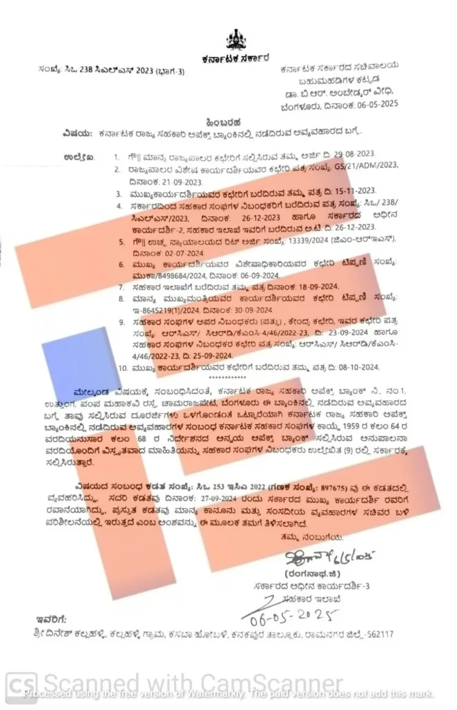 ಇದಕ್ಕೆ ಸಂಬಂಧಿಸಿದ ಕಡತವು (ಸಂಖ್ಯೆ; ಸಿಒ 253 ಇಸಿಎ 2022 (ಗಣಕ ಸಂಖ್ಯೆ 897675) 2024ರ ಸೆ.27ರಂದು ರಾಜ್ಯ ಸರ್ಕಾರದ ಮುಖ್ಯ ಕಾರ್ಯದರ್ಶಿಗೆ ರವಾನೆಯಾಗಿತ್ತು. ಆ ನಂತರ ಈ ಕಡತವು ಕಾನೂನು, ಸಂಸದೀಯ ವ್ಯವಹಾರಗಳ ಸಚಿವ ಎಚ್ ಕೆ ಪಾಟೀಲ್ ಅವರ ಪರಿಶೀಲನೆಯಲ್ಲಿತ್ತು ಎಂದು ಸಹಕಾರ ಇಲಾಖೆಯು ದಿನೇಶ್ ಕಲ್ಲಹಳ್ಳಿ ಅವರಿಗೆ 2025ರ ಮೇ 6ರಂದು ಹಿಂಬರಹ ನೀಡಿತ್ತು.