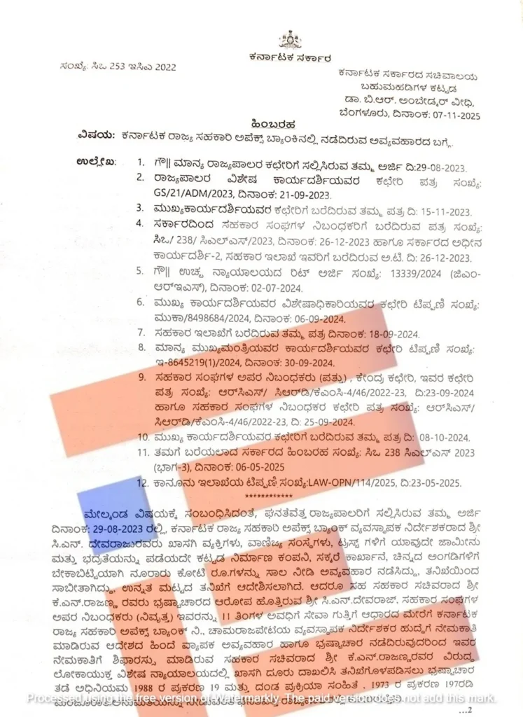 ಸಾಮಾಜಿಕ ಕಾರ್ಯಕರ್ತ ದಿನೇಶ್ ಕಲ್ಲಹಳ್ಳಿ ಅವರು ಕರ್ನಾಟಕ ರಾಜ್ಯ ಸಹಕಾರಿ ಅಪೆಕ್ಸ್ ಬ್ಯಾಂಕ್ನಲ್ಲಿ ನಡೆದಿದೆ ಎನ್ನಲಾದ ಅಕ್ರಮಗಳ ಕುರಿತು ಕೆ ಎನ್ ರಾಜಣ್ಣ ಮತ್ತು ಸಿ ಎನ್ ದೇವರಾಜ್ ಅವರ ವಿರುದ್ಧ ಖಾಸಗಿ ದೂರು ದಾಖಲಿಸಲು 2023ರ ಆಗಸ್ಟ್ 23ರಂದೇ ರಾಜ್ಯಪಾಲರಿಗೆ ಮನವಿ ಸಲ್ಲಿಸಿದ್ದರು. ಈ ಮನವಿ ಆಧರಿಸಿ ಕ್ರಮಕೈಗೊಳ್ಳಬೇಕು ಎಂದು ರಾಜ್ಯಪಾಲರ ಕಚೇರಿಯು ಸರ್ಕಾರಕ್ಕೆ ಸೂಚಿಸಿತ್ತು.