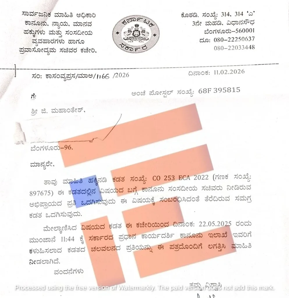 ಈ ಕುರಿತು ‘ದಿ ಫೈಲ್’, ಅರ್ ಟಿ ಐ ಅಡಿ ಕಾನೂನು ಸಚಿವ ಎಚ್ ಕೆ ಪಾಟೀಲ್ ಅವರ ಕಚೇರಿಗೆ ಅರ್ಜಿ ಸಲ್ಲಿಸಿತ್ತು. ಇದಕ್ಕೆ ಮಾಹಿತಿ ನೀಡಿರುವ ಸಚಿವರ ಕಚೇರಿಯು, ಕಾನೂನು ಸಚಿವರು ನೀಡಿರುವ ಅಭಿಪ್ರಾಯವನ್ನು ಒದಗಿಸಿಲ್ಲ. ಬದಲಿಗೆ ಕಡತದ ಚಲನವಲನದ ಮಾಹಿತಿಯನ್ನಷ್ಟೇ ನೀಡಿ ಕೈ ತೊಳೆದುಕೊಂಡಿದೆ.