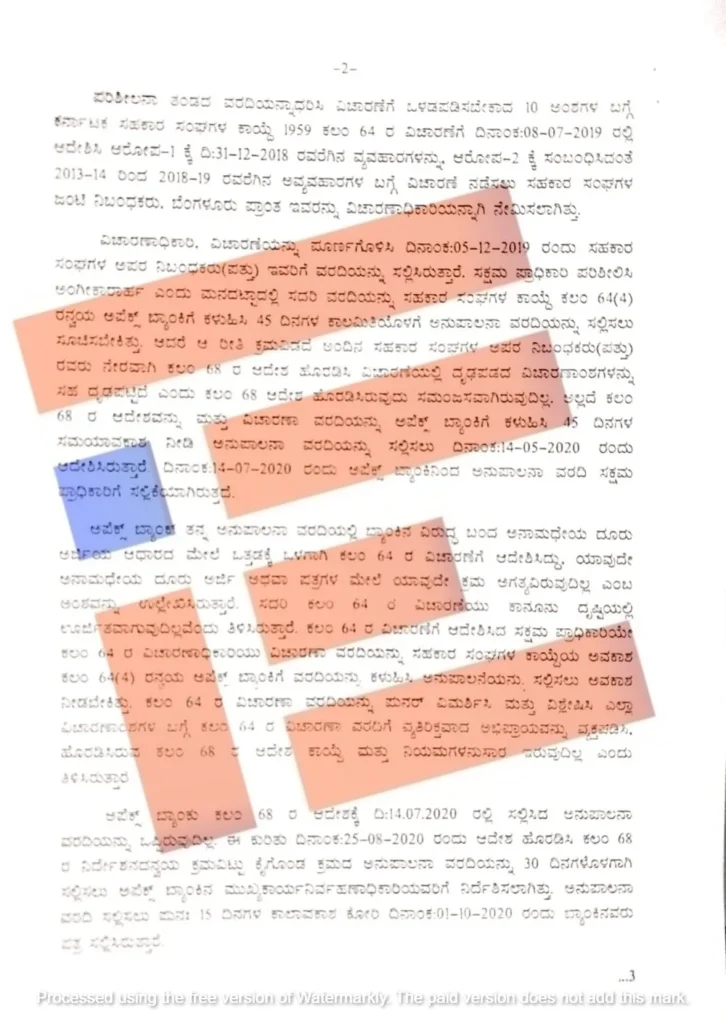 ಹಾಗೆಯೇ ಈ ಎಲ್ಲಾ ಪ್ರಕರಣಗಳನ್ನು ಪರಿಶೀಲಿಸಿ ದಾಖಲಾತಿಗಳೊಂದಿಗೆ ಸ್ಪಷ್ಟವಾಗಿ ಆರೋಪ ದೃಢಪಟ್ಟಿರುವ ಅಥವಾ ದೃಢಪಡದಿರುವ ಬಗ್ಗೆ ವಿಚಾರಣಾಧಿಕಾರಿ ನಮೂದಿಸಿ ಜವಾಬ್ದಾರಿ ನಿಗದಿಪಡಿಸಿ ಮುಂದುವರೆದ ವಿಚಾರಣೆಗೆ ಆದೇಶಿಸುವುದು ಸೂಕ್ತವೆಂದು 2020ರ ಅಕ್ಟೋಬರ್ 17ರಂದು ಆದೇಶಿಸಲಾಗಿತ್ತು. ಈ ಸಂಬಂಧ 2021ರ ಡಿಸೆಂಬರ್ 31ರಂದು ಬ್ಯಾಂಕ್ ಅನುಪಾಲನಾ ವರದಿ ಸಲ್ಲಿಸಿತ್ತು.