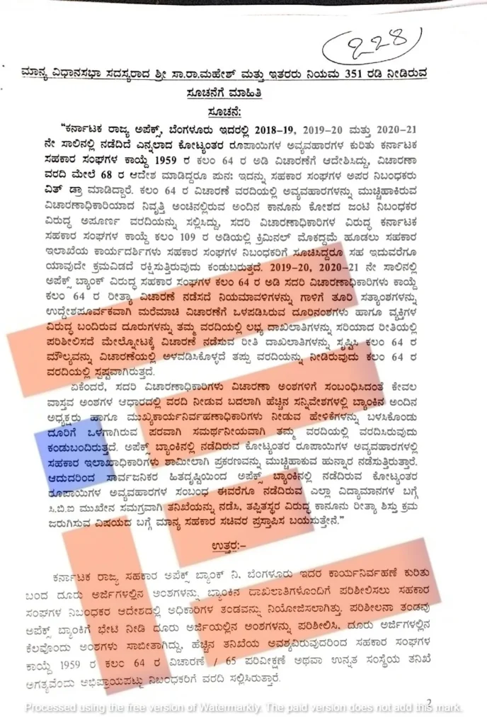 ಈ ಕುರಿತು ಜೆಡಿಎಸ್ ಶಾಸಕ ಸಾ ರಾ ಮಹೇಶ್ ಅವರು ನೀಡಿದ್ದ ನಿಯಮ 351ರ ಅಡಿ ಸೂಚನೆಗೆ ಸಂಬಂಧಿಸಿದಂತೆ ಸಹಕಾರ ಸಚಿವ ಎಸ್ ಟಿ ಸೋಮಶೇಖರ್ ಅವರು ಸಿಬಿಐ ತನಿಖೆಗೆ ಒಳಪಡಿಸುವ ಅಗತ್ಯತೆ ಕಂಡು ಬರುವುದಿಲ್ಲ ಎಂದು ಮಾಹಿತಿ ಒದಗಿಸಿದ್ದರು.
