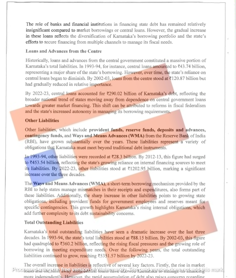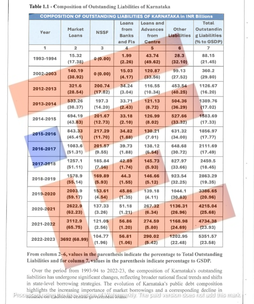 2022-23ರ ಕೊನೆಗೆ ರಾಜ್ಯದ ಸಾಲಬಾಧ್ಯತೆಯು ರೂ 5351.57 ಶತಕೋಟಿಯನ್ನು ಮುಟ್ಟಿತು. ರಾಜ್ಯದ ಸಾಲಬಾಧ್ಯತೆಯು 2026ರ ಮಾರ್ಚ್ ವೇಳೆಗೆ ರೂ 7.64 ಲಕ್ಷ ಕೋಟಿಯನ್ನು ತಲುಪುವ ಅಂದಾಜಿದ್ದು, ಇದು 1993-94ಕ್ಕೆ ಹೋಲಿಸಿದರೆ 87 ಪಟ್ಟುಗಳಷ್ಟು ಅಧಿಕವಾಗಲಿದೆ ಎಂದ ವರದಿಯು ವಿವರಿಸಿದೆ.