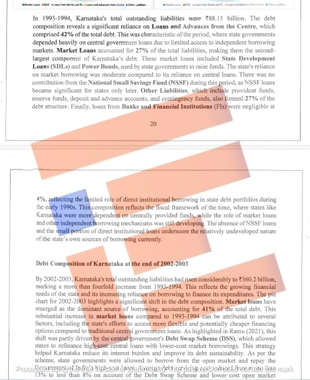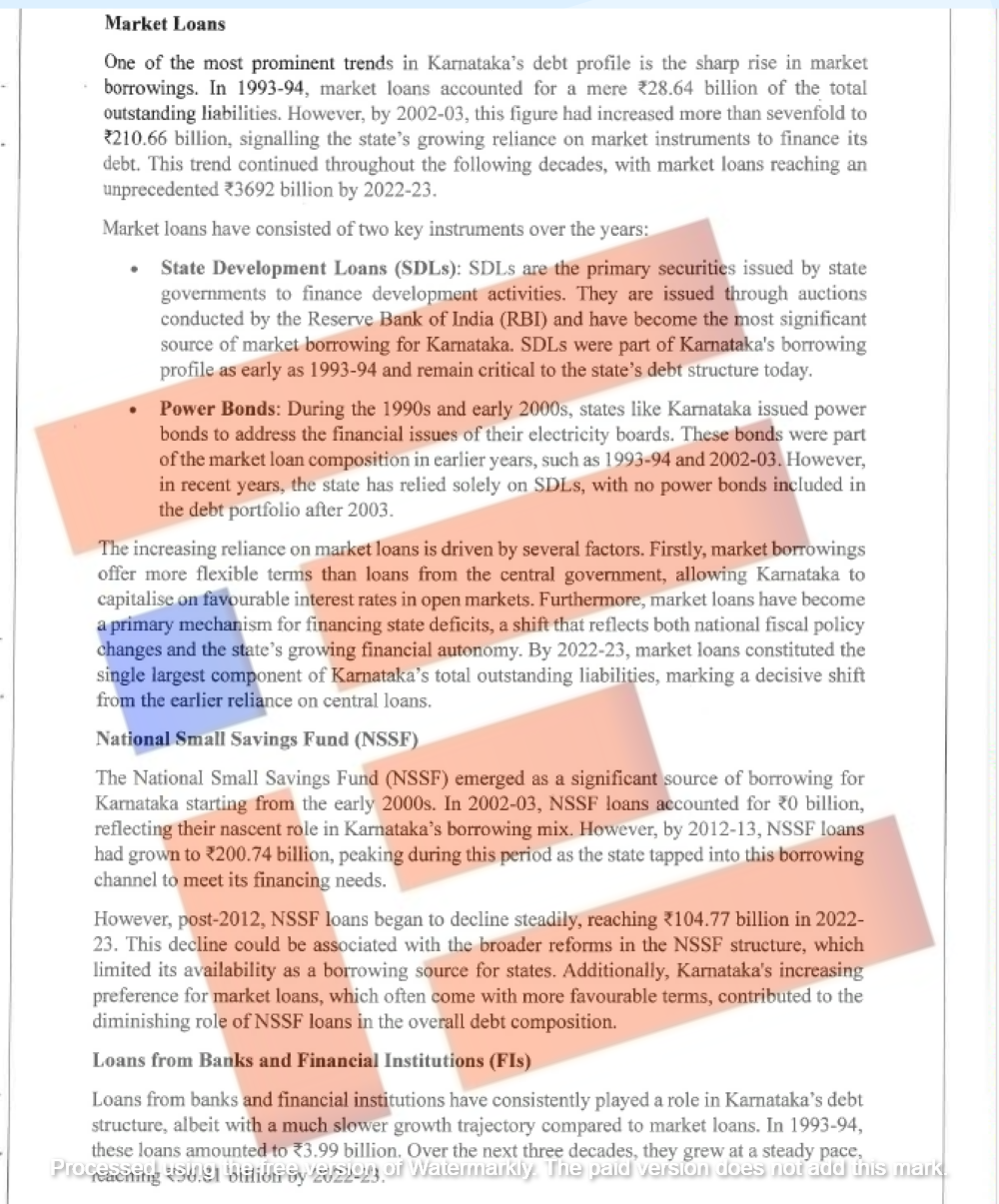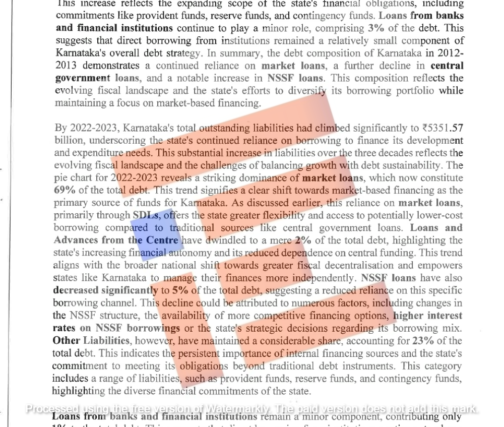 ರಾಜ್ಯ ಅಭಿವೃದ್ಧಿ ಸಾಲಗಳು (ಎಸ್ ಡಿ ಎಲ್ ಗಳು) ಮತ್ತು ಪವರ್ ಬಾಂಡ್ ಗಳ ಮೂಲಕ ರಾಜ್ಯ ಸರ್ಕಾರವು ಎತ್ತುವಳಿ ಮಾಡಿದ ನಗದನ್ನು ಇದು ಒಳಗೊಂಡಿತ್ತು. ಇನ್ನು, ಆಗ ರಾಜ್ಯವು ರಾಷ್ಟ್ರೀಯ ಸಣ್ಣ ಉಳಿತಾಯ ನಿಧಿಯ (ಎನ್ ಎಸ್ ಎಸ್ ಎಫ್) ಕಡೆಯಿಂದ ಯಾವ ಸಾಲವನ್ನೂ ಪಡೆದಿರಲಿಲ್ಲ. ಇದನ್ನು ಹೊರತುಪಡಿಸಿ, ‘ಇತರ ಸಾಲಮೂಲ’ಗಳಾದ (ಅದರ್ ಲಯಬಿಲಿಟೀಸ್), ಭವಿಷ್ಯನಿಧಿ, ಮೀಸಲು ನಿಧಿ, ಠೇವಣಿ ಹಾಗೂ ಮುಂಗಡ ಖಾತೆ ಮತ್ತು ಸಂಕಷ್ಟ ನಿಧಿಗಳಿಂದ ಪಡೆದ ಕಡದ ಪ್ರಮಾಣ ಶೇಕಡಾ 27ರಷ್ಟಿತ್ತು. ಬ್ಯಾಂಕುಗಳು ಮತ್ತು ಹಣಕಾಸು ಸಂಸ್ಥೆಗಳಿಂದ ಪಡೆದ ಸಾಲ ಶೇಕಡಾ 4ರಷ್ಟು ಮಾತ್ರ ಇತ್ತು.