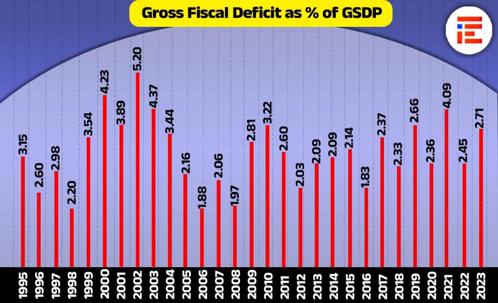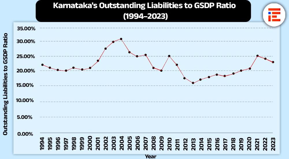 ಆದರೆ, ಕೋವಿಡ್ ಸೋಂಕಿನ 2019-20ರ ಅವಧಿಯಲ್ಲಿ ಇದು ಪುನಃ ಶೇಕಡಾ 25ರಷ್ಟನ್ನು ಮೀರಿ, ನಂತರದ ವರ್ಷಗಳಲ್ಲಿ ಶೇಕಡಾ 24ರ ಆಜೂಬಾಜಿನಲ್ಲಿರುವುದನ್ನು ಕಾಣಬಹುದಾಗಿದೆ. ಒಂದೆಡೆ, ಕಳೆದ ಮೂರು ದಶಕಗಳಲ್ಲಿ ರಾಜ್ಯದ ಸಾಲಬಾಧ್ಯತೆ ತೀವ್ರವಾಗಿ ಏರಿಕೆ ಕಂಡಿರುವಂತೆಯೇ, ಮತ್ತೊಂದೆಡೆ, ರಾಜ್ಯದ