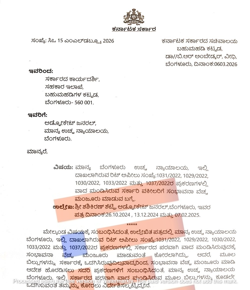 ಈ ಸರ್ಕಾರಿ ವಕೀಲರು ಸಂಭಾವನೆ ಕೋರಿ ಸಲ್ಲಿಸಿದ್ದ ಅರ್ಜಿಗಳನ್ನು ಪರಿಶೀಲಿಸಿದ್ದ  ಸಹಕಾರ ಇಲಾಖೆಯು ಮೂಲ ಬಿಲ್‌ಗಳನ್ನು ಕೂಡಲೇ ಒದಗಿಸಬೇಕು ಎಂದು ಅಡ್ವೋಕೇಟ್ ಜನರಲ್ ಅವರಿಗೆ ಇಲಾಖೆಯ ಸರ್ಕಾರದ ಕಾರ್ಯದರ್ಶಿಯು 2026ರ ಮಾರ್ಚ್‌ 6ರಂದು  ಪತ್ರ ಬರೆದಿರುವುದು ಗೊತ್ತಾಗಿದೆ.