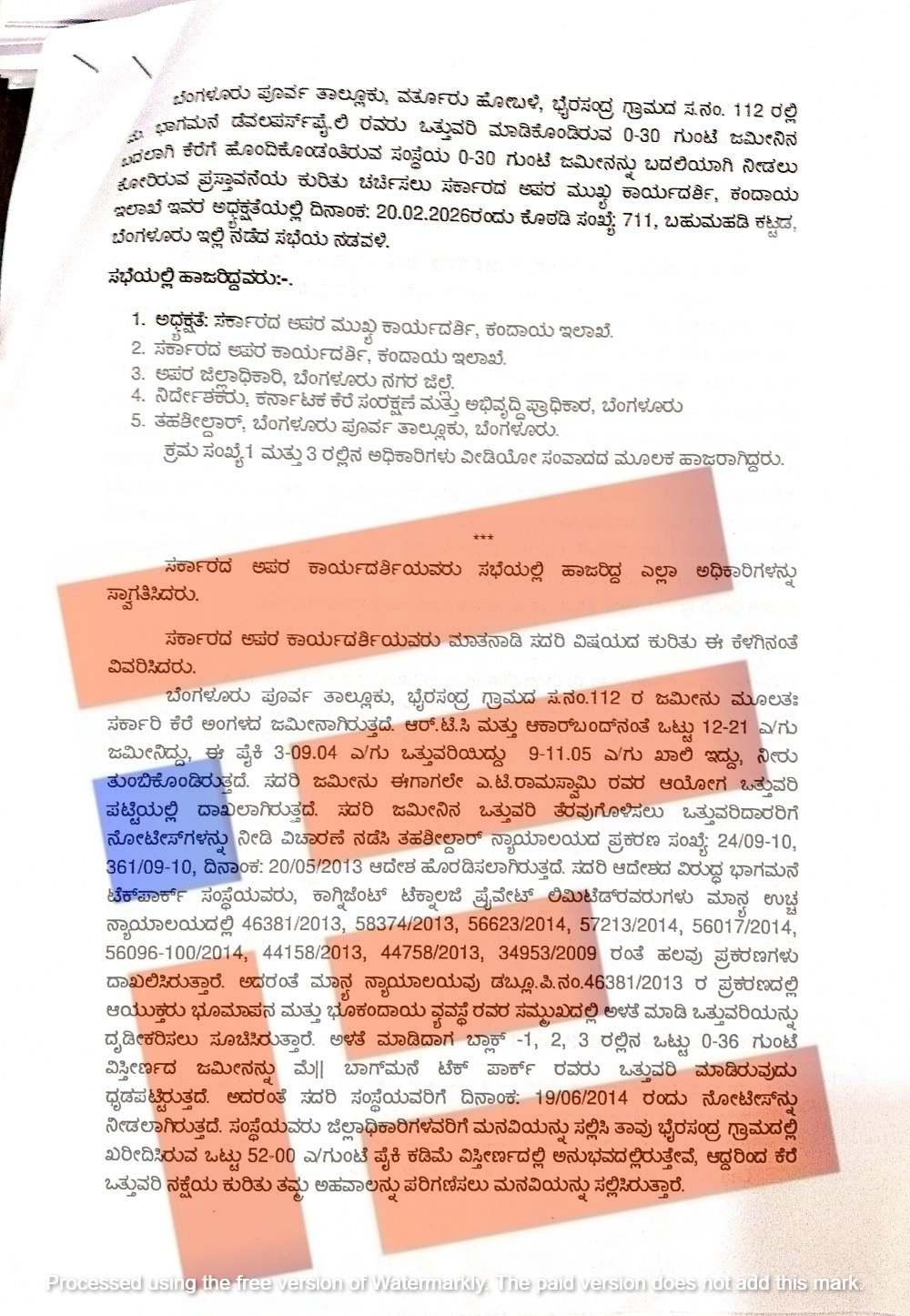 ಈ ಪ್ರಕರಣದ ಕುರಿತು ಪ್ರಾದೇಶಿಕ ಆಯುಕ್ತರು, ಜಿಲ್ಲಾಧಿಕಾರಿ ಮತ್ತು ಕಾನೂನು ಇಲಾಖೆಯು ನೀಡಿದ್ದ ಅಭಿಪ್ರಾಯದ ಕುರಿತು ತೀರ್ಮಾನ ಕೈಗೊಳ್ಳಲು ಕಂದಾಯ ಇಲಾಖೆಯ ಸರ್ಕಾರದ ಪ್ರಧಾನ ಕಾರ್ಯದರ್ಶಿ ರಾಜೇಂದರ್ ಕುಮಾರ್ ಕಟಾರಿಯ ಅವರ ನೇತೃತ್ವದಲ್ಲಿ 2026ರ ಫೆ.20ರಂದು ಸಭೆ ಸೇರಿತ್ತು.