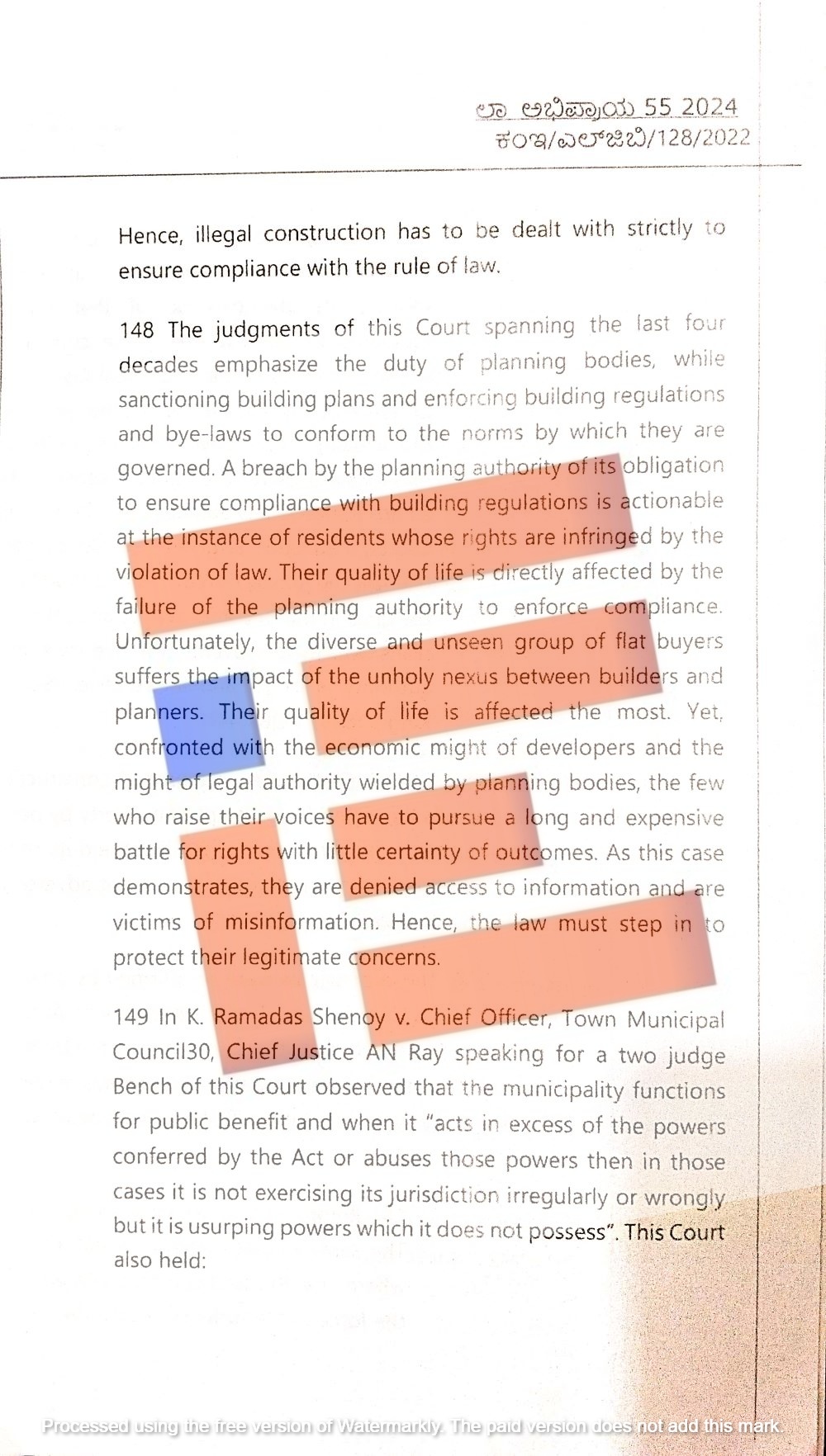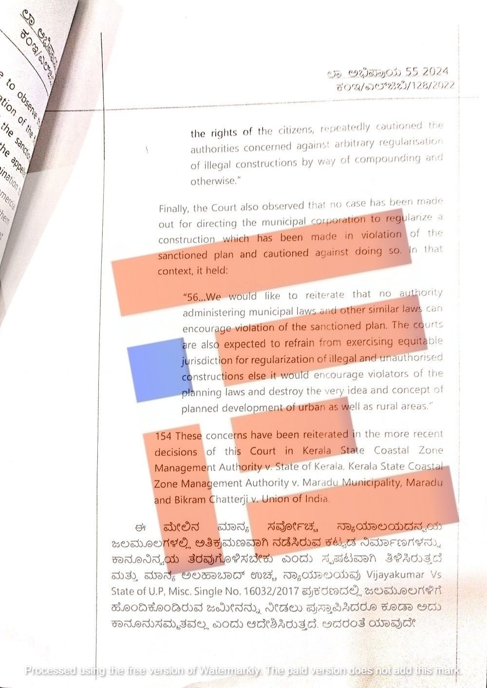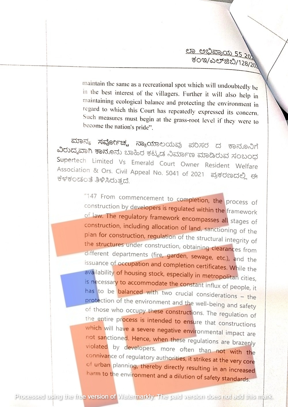 ಸರ್ವೋಚ್ಛ ನ್ಯಾಯಾಲಯವು ಹಿಂಚ್ ಲಾಲ್ ತಿವಾರಿ/ಕಮಲಾ ದೇವಿ ಮತ್ತಿತರರು (3215) ಪ್ರಕರಣ, ಸೂಪರ್ ಟೆಕ್ ಲಿಮಿಟೆಡ್ /ಎಮೆರಾಲ್ಡ್ ಕೋರ್ಟ್ ಓನರ್ ರೆಸಿಡೆಂಟ್ ಅಸೋಸಿಯೇಷನ್ (ಸಿವಿಲ್ಅಪೀಲ್ 5041/2021), ಫ್ರೆಂಡ್ಸ್ ಕಾಲೋನಿ ಡೆವಲೆಪ್ಮೆಂಟ್ ಕಮಿಟಿ/ಒರಿಸಾ ರಾಜ್ಯ ಸರ್ಕಾರ, ಈಶ ಏಕ್ತಾ ಅಪಾರ್ಟ್ಮೆಂಟ್ಸ್ ಹೌಸಿಂಗ್ ಸೊಸೈಟಿ/ಮುಂಬೈ ಮುನ್ಸಿಪಲ್ ಕಾರ್ಪೋರೇಷನ್, ಕೇರಳ ಕೋಸ್ಟಲ್ ಝೋನ್ ಮ್ಯಾನೇಜ್ಮೆಂಟ್ ಅಥಾರಿಟಿ/ಕೇರಳ ಸರ್ಕಾರದ ಪ್ರಕರಣದಲ್ಲಿ ನೀಡಿದ್ದ ತೀರ್ಪುಗಳನ್ನು ಅವಲೋಕಿಸಿ ತನ್ನ ಅಭಿಪ್ರಾಯ ನೀಡಿದೆ.