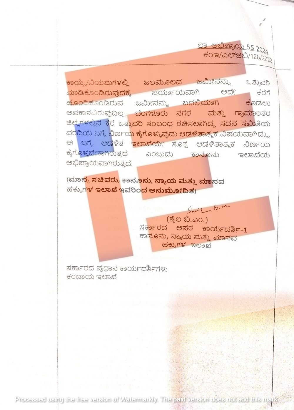 ಬೆಂಗಳೂರು ನಗರ ಮತ್ತು ಗ್ರಾಮಾಂತರ ಜಿಲ್ಲೆಗಳಲ್ಲಿನ ಕೆರೆ ಒತ್ತುವರಿ ಸಂಬಂಧ ರಚಿಸಿದ್ದ ಸದನ ಸಮಿತಿಯ ವರದಿ ಬಗ್ಗೆ ನಿರ್ಣಯ ಕೈಗೊಳ್ಳುವುದು ಆಡಳಿತಾತ್ಮಕ ವಿಷಯವಾಗಿದೆ. ಈ ಬಗ್ಗೆ ಆಡಳಿತ ಇಲಾಖೆಯೇ ಸೂಕ್ತ ಆಡಳಿತಾತ್ಮಕ ನಿರ್ಣಯ ಕೈಗೊಳ್ಳಬೇಕು ಎಂದು ಕಾನೂನು ಇಲಾಖೆಯು ತನ್ನ ಅಭಿಪ್ರಾಯದಲ್ಲಿ ತಿಳಿಸಿತ್ತು.