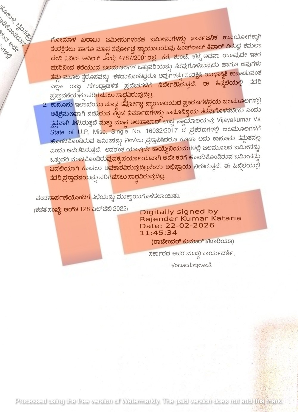 ಸುಪ್ರೀಂ ಕೋರ್ಟ್ ನೀಡಿರುವ ಈ ಎಲ್ಲಾ ತೀರ್ಪುಗಳನ್ನು ಅವಲೋಕಿಸಿರುವ ಕಾನೂನು ಇಲಾಖೆಯು ಜಲಮೂಲಗಳಲ್ಲಿ ಅತಿಕ್ರಮಣವಾಗಿ ನಡೆಸಿರುವ ಕಟ್ಟಡ ನಿರ್ಮಾಣಗಳನ್ನು ಕಾನೂನಿನ ಅನ್ವಯ ತೆರವುಗೊಳಿಸಬೇಕು ಎಂದು ಸ್ಪಷ್ಟವಾಗಿ ತಿಳಿಸಿದೆ. ಅಲ್ಲದೇ ಅಲಹಾಬಾದ್ ಉಚ್ಛ ನ್ಯಾಯಾಲಯವೂ ಸಹ ವಿಜಯಕುಮಾರ್/ಉತ್ತರ ಪ್ರದೇಶ (ಎಂಐಎಸ್ಸಿ ಸಿಂಗಲ್ ನಂ 16032/2017) ಪ್ರಕರಣದಲ್ಲಿ ಜಲಮೂಲಗಳಿಗೆ ಹೊಂದಿಕೊಂಡಿರುವ ಜಮೀನನ್ನು ನೀಡಲು ಪ್ರಸ್ತಾಪಿಸಿದರೂ ಕೂಡಾ ಅದು ಕಾನೂನು ಸಮ್ಮತವಲ್ಲ ಎಂದು ಆದೇಶಿಸಿದೆ.