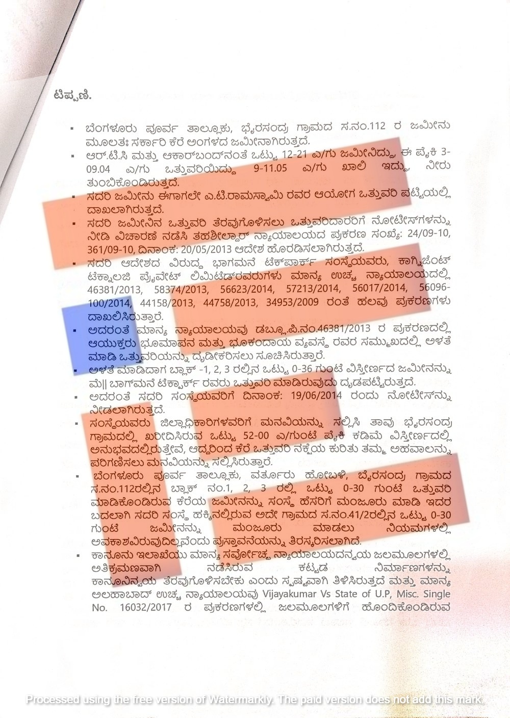 ಈ ಜಮೀನಿನ ಒತ್ತುವರಿ ತೆರವುಗೊಳಿಸಲು ಒತ್ತುವರಿದಾರರಿಗೆ ಹಲವು ನೋಟೀಸ್ಗಳನ್ನು ನೀಡಿ ವಿಚಾರಣೆ ನಡೆಸಿತ್ತು. ತಹಶೀಲ್ದಾರ್ ನ್ಯಾಯಾಲಯವು (ಪ್ರಕರಣ ಸಂಖ್ಯೆ; 24/09-10, 361/09-10) 2013ರ ಮೇ 20ರಂದು ಆದೇಶ ಹೊರಡಿಸಿತ್ತು. ಈ ಆದೇಶದ ವಿರುದ್ಧ ಭಾಗಮನೆ ಟೆಕ್ ಪಾರ್ಕ್ ಮತ್ತು ಕಾಗ್ನಿಜೆಂಟ್ ಟೆಕ್ನಾಲಜಿ ಪ್ರೈವೈಟ್ ಲಿಮಿಟೆಡ್ ಉಚ್ಛ ನ್ಯಾಯಾಲಯದಲ್ಲಿ ಪ್ರಕರಣ (ಸಂಖ್ಯೆ 46391/2013, 58374/2013, 56623/2014, 57213/2014, 56017/2014, 56096/100/2014, 44158/2013, 44758/2013, 34953/2009) ದಾಖಲಿಸಿದ್ದರು. ಈ ಪೈಕಿ ರಿಟ್ ಅರ್ಜಿ 46381/2013ರ ಪ್ರಕರಣದಲ್ಲಿ ಭೂಮಾಪನ ಮತ್ತು ಭೂ ಕಂದಾಯ ವ್ಯವಸ್ಥೆಯ ಆಯುಕ್ತರ ಸಮ್ಮುಖದಲ್ಲಿ ಅಳತೆ ಮಾಡಿ ಒತ್ತುವರಿಯನ್ನು ದೃಢೀಕರಿಸಲು ಹೈಕೋರ್ಟ್ ಸೂಚಿಸಿತ್ತು.