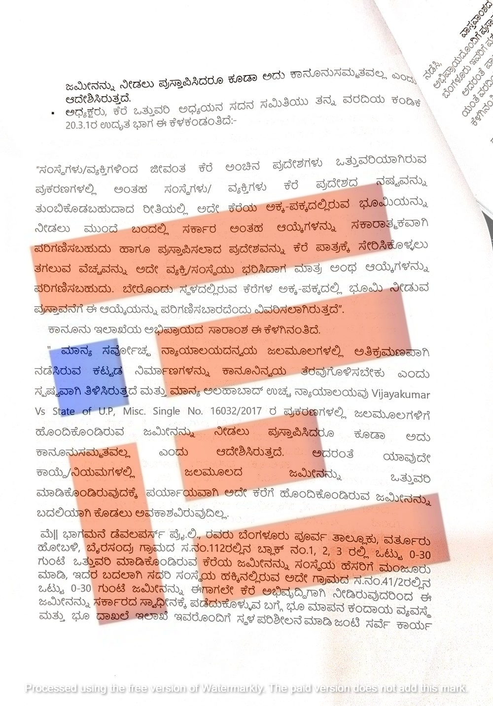 ಅದರಂತೆ ಯಾವುದೇ ಕಾಯ್ದೆ, ನಿಯಮಗಳಲ್ಲಿ ಜಲಮೂಲದ ಜಮೀನನ್ನು ಒತ್ತುವರಿ ಮಾಡಿಕೊಂಡಿರುವುದನ್ನು ಪರ್ಯಾಯವಾಗಿ ಅದೇ ಕೆರೆಗೆ ಹೊಂದಿಕೊಂಡಿರುವ ಜಮೀನನ್ನು ಬದಲಿಯಾಗಿ ಕೊಡಲು ಅವಕಾಶವಿಲ್ಲ.