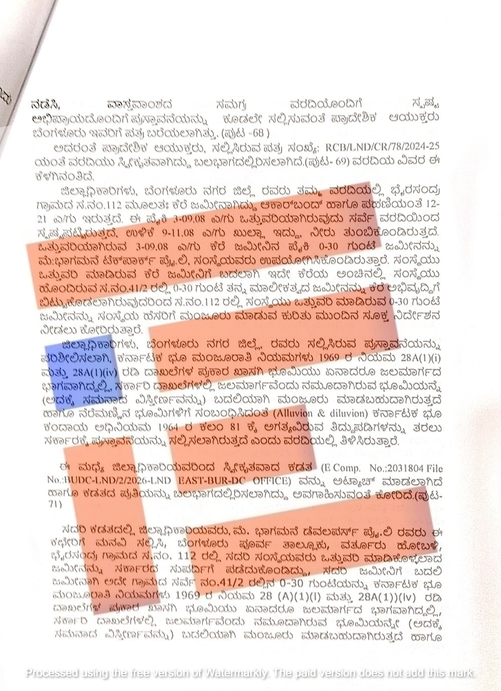 ಜಿಲ್ಲಾಧಿಕಾರಿಗಳು ಸಲ್ಲಿಸಿದ್ದ ವರದಿಯನ್ನು ಪ್ರಾದೇಶಿಕ ಆಯುಕ್ತರು ಪರಿಶೀಲಿಸಿದ್ದರು. ಜಮೀನನ್ನು ಮಂಜೂರು ಮಾಡಲು ನಿಯಮಗಳಲ್ಲಿ ಅವಕಾಶವಿಲ್ಲವೆಂದು 2023ರ ಜೂನ್ 12 ಮತ್ತು 2023ರ ಜುಲೈ 5ರಂದು ಭಾಗಮನೆ ಡೆವಲಪರ್ಸ್ಗೆ ಹಿಂಬರಹ ನೀಡಲಾಗಿದೆ ಎಂದು ಸರ್ಕಾರಕ್ಕೆ ವರದಿ ಸಲ್ಲಿಸಿದ್ದರು. ಈ ಜಮೀನಿನ ಪ್ರಕರಣದಲ್ಲಿ ಕಾನೂನು ಅಡೆತಡೆಗಳಿದ್ದರೂ ಸಹ ನೆರೆ ಮಣ್ಣಿನ ಭೂಮಿಗಳಿಗೆ ಸಂಬಂಧಿಸಿದಂತೆ ಇದ್ದ ಕರ್ನಾಟಕ ಭೂ ಕಂದಾಯ ಅಧಿನಿಯಮ 1964ರಕಲಂ 81ಕ್ಕೆ 2025ರಲ್ಲಿ ತಂದಿದ್ದ ತಿದ್ದಪಡಿಯಂತೆ ಬದಲಿ ಜಮೀನನ್ನು ಮಂಜೂರು ಮಾಡಬೇಕು ಎಂದು ಸರ್ಕಾರಕ್ಕೆ ಪುನಃ ಪ್ರಸ್ತಾವ ಸಲ್ಲಿಕೆಯಾಗಿತ್ತು.