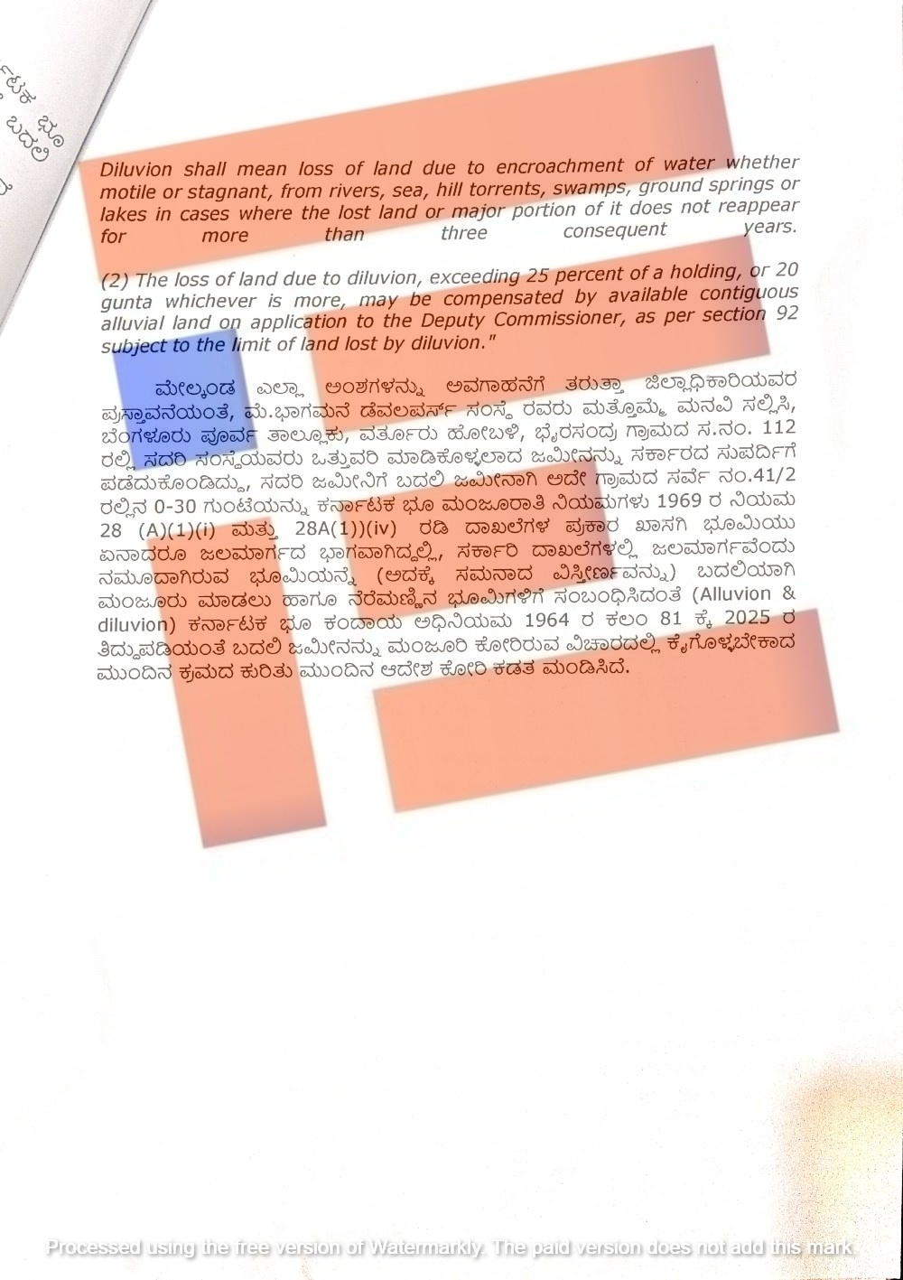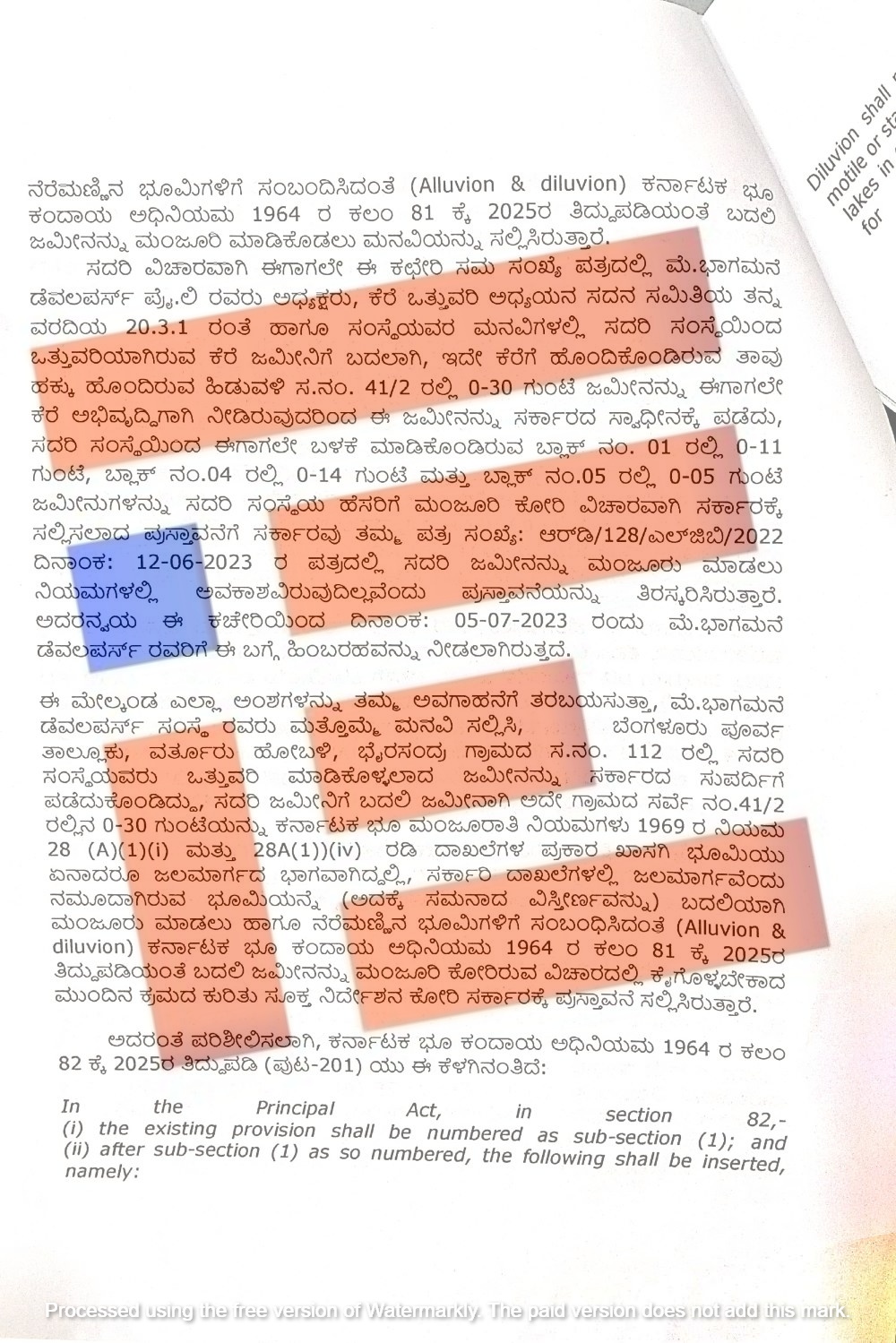 ಅಲ್ಲದೇ ಕರ್ನಾಟಕ ಭೂ ಮಂಜೂರಾತಿ ನಿಯಮಗಳು 1969ರ ನಿಯಮ 28 ಎ (1) (i) ಮತ್ತು 28 ಎ (1) (iv) ಪ್ರಕಾರ ಖಾಸಗಿ ಭೂಮಿಯು ಏನಾದರೂ ಜಲಮಾರ್ಗದ ಭಾಗವಾಗಿದ್ದಲ್ಲಿ ಸರ್ಕಾರಿ ದಾಖಲೆಗಳಲ್ಲಿ ಜಲಮಾರ್ಗವೆಂದು ನಮೂದಾಗಿರುವ ಭೂಮಿಯನ್ನೇ (ಅದಕ್ಕೆ ಸಮನಾದ ವಿಸ್ತೀರ್ಣವನ್ನು) ಬದಲಿಯಾಗಿ ಮಂಜೂರು ಮಾಡಬಹುದು ಎಂದೂ ಜಿಲ್ಲಾಧಿಕಾರಿ ತಮ್ಮ ವರದಿಯಲ್ಲಿ ತಿಳಿಸಿದ್ದರು. ಅಲ್ಲದೇ ನೆರೆಮಣ್ಣಿನ ಭೂಮಿಗಳಿಗೆ ಸಂಬಂಧಿಸಿದಂತೆ ಕರ್ನಾಟಕ ಭೂ ಕಂದಾಯ ಅಧಿನಿಯಮ 1964ರ ಕಲಂ 81ಕ್ಕೆ ಅಗತ್ಯವಿರುವ ತಿದ್ದುಪಡಿಗಳನ್ನು ತರಬೇಕು ಎಂಬ ಪ್ರಸ್ತಾವನೆಯನ್ನೂ ಸಲ್ಲಿಸಿದ್ದರು.