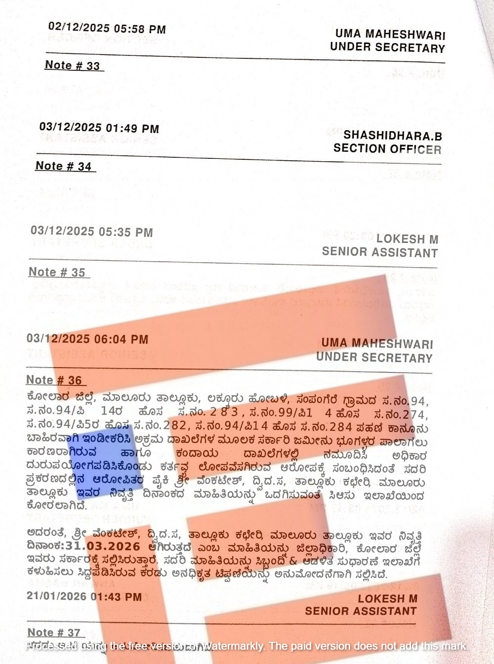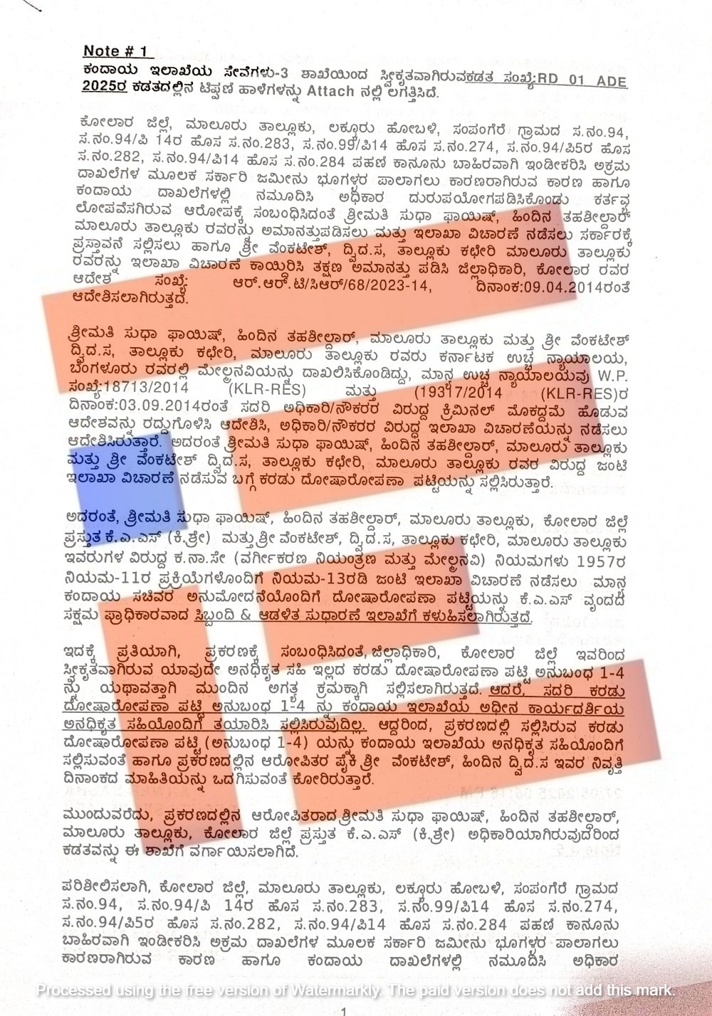 ಕೋಲಾರ ಜಿಲ್ಲೆ ಮಾಲೂರು ತಾಲೂಕಿನ ಲಕ್ಕೂರು ಹೋಳಿಯ ಸಂಪಂಗೆರೆ ಗ್ರಾಮದ ಸರ್ವೆ ನಂಬರ್ 94, 94/ಪಿ 14ರ ಹೊಸ ಸರ್ವೆ ನಂಬರ್ 283, ಸರ್ವೆ ನ ಂಬರ್ 99/ಪಿ 14 ಹೊಸ ಸರ್ವೆ ನಂಬರ್ 274, ಸರ್ವೆನಂಬರ್ 94/ಪಿ5 ರ ಹೊಸ ಸರ್ವೆನಂಬರ್ 282, ಸರ್ವೆ ನಂಬರ್ 94/ಪಿ 14ರ ಹೊಸ ಸರ್ವೆ ನಂಬರ್ 284 ಪಹಣಿಯನ್ನು ಕಾನೂನುಬಾಹಿರವಾಗಿ ಇಂಡೀಕರಿಸಲಾಗಿದೆ.