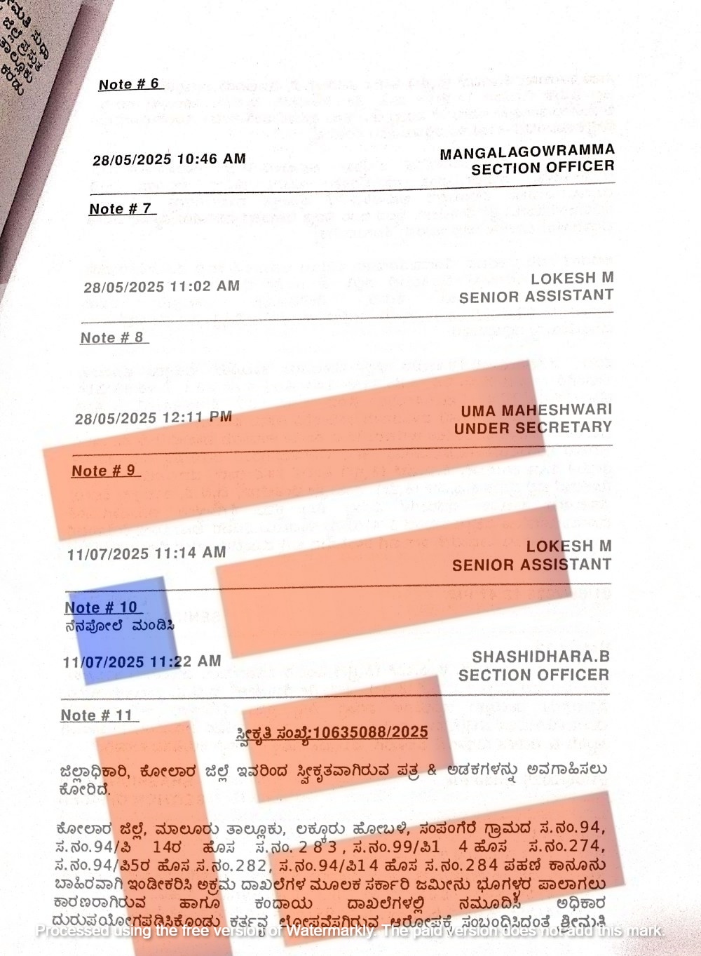 ಕೋಲಾರ ಜಿಲ್ಲೆ ಮಾಲೂರು ತಾಲೂಕಿನ ಲಕ್ಕೂರು ಹೋಬಳಿ ಸೇರಿದಂತೆ ವಿವಿಧೆಡೆ ಸರ್ಕಾರಿ ಜಮೀನುಗೋಮಾಳ ಹಾಗೂ ಶಾಲೆಗೆ ದಾನ ನೀಡಿದ ಭೂಮಿಯನ್ನು ನಕಲಿ ದಾಖಲೆಗಳ ಮೂಲಕ ಕಬಳಿಸಲಾಗುತ್ತಿದೆ. ಪ್ರಭಾವಿಗಳು ಮತ್ತು ಅಧಿಕಾರಿಗಳ ಶಾಮೀಲಿನಿಂದ 50 ಎಕರೆಗೂ ಹೆಚ್ಚು ಭೂಮಿ ಲೂಟಿಯಾಗಿದೆ. ನಕಲಿ ಪಿ ನಂಬರ್ (P-number) ದುರಸ್ತಿ ಅಕ್ರಮ ಸಾಗುವಳಿ ದಂಧೆ ಹಾಗೂ ಮರಣ ಹೊಂದಿದವರಿಗೆ ಭೂಮಿ ಮಂಜೂರು ಮಾಡಿದ ಪ್ರಕರಣಗಳಲ್ಲಿ ಭಾಗಿಯಾಗಿರುವ ಅಧಿಕಾರಿಗಳ ವಿರುದ್ಧ ದೋಷಾರೋಪಣೆ ಪಟ್ಟಿಯೂ ಸಲ್ಲಿಕೆಯಾಗಿಲ್ಲ.