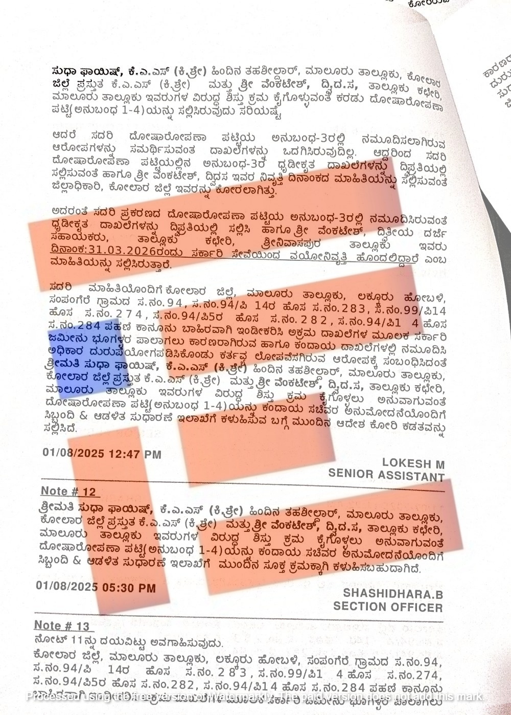 ಮಾಲೂರು ತಾಲೂಕಿನ ವಿವಿಧ ಸರ್ವೆ ನಂಬರ್ಗಳಲ್ಲಿನ ಸರ್ಕಾರಿ ಜಮೀನು ಭೂಗಳ್ಳರ ಪಾಲಾಗಿರುವ ಪ್ರಕರಣಗಳಲ್ಲಿ ಹಿಂದಿನ ತಹಶೀಲ್ದಾರ್ ಸುಧಾ ಫಾಯಿಷ್ ಮತ್ತು ತಾಲೂಕು ಕಚೇರಿಯ ದ್ವಿತೀಯ ದರ್ಜೆ ಗುಮಾಸ್ತ ವೆಂಕಟೇಶ್ ಮತ್ತಿತರರು ಭಾಗಿಯಾಗಿದ್ದಾರೆ ಎಂಬ ಆರೋಪಗಳು ಕೇಳಿ ಬಂದಿದ್ದವು. ಈ ಅಧಿಕಾರಿಗಳ ವಿರುದ್ಧ ಜಂಟಿ ಇಲಾಖೆ ವಿಚಾರಣೆ ನಡೆಸಲು ಕ್ರಮ ಕೈಗೊಂಡಿದೆಯಾದರೂ ದೋಷಾರೋಪಣೆ ಪಟ್ಟಿ ತಯಾರಿಕೆಯಲ್ಲಿಯೇ ಕಾಲಹರಣ ಮಾಡಲಾಗುತ್ತಿದೆ.