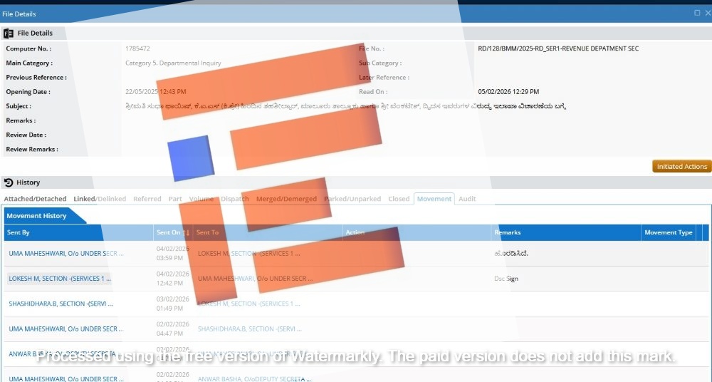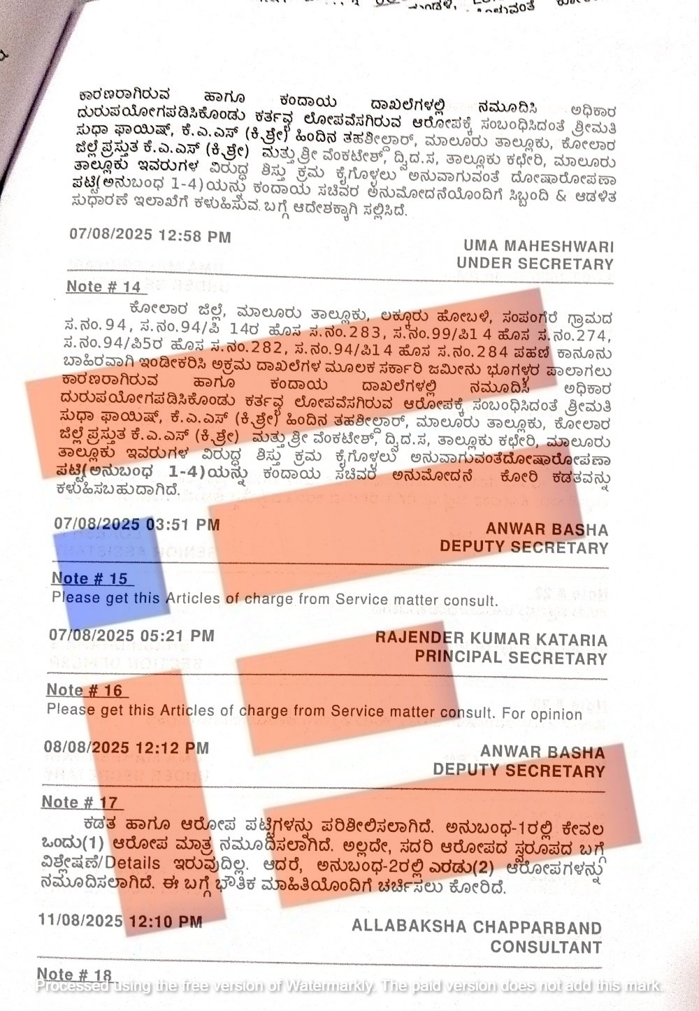 ಇವರ ವಿರುದ್ಧ ಕರ್ನಾಟಕ ನಾಗರಿಕ ಸೇವೆ (ವರ್ಗೀಕರಣ, ನಿಯಂತ್ರಣ ಮತ್ತು ಮೇಲ್ಮನವಿ) ನಿಯಮ 1957ರ ನಿಯಮ 11ರ ಪ್ರಕ್ರಿಯೆಗಳೊಂದಿಗೆ ನಿಯಮ 13ರ ಅಡಿ ಜಂಟಿ ಇಲಾಖೆ ವಿಚಾಋಣೆ ನಡೆಸಲು ದೋಷಾರೋಪಣೆ ಪಟ್ಟಿ ತಯಾರಿಸಿತ್ತು. ಇದಕ್ಕೆ ಪ್ರತಿಯಾಗಿ ಪ್ರಕರಣಕ್ಕೆ ಸಂಬಂಧಿಸಿದಂತೆ ಕೋಲಾರ ಜಿಲ್ಲೆಯ ಜಿಲ್ಲಾಧಿಕಾರಿಯಿಂದ ಸ್ವೀಕೃತವಾಗಿದ್ದ ಯಾವುದೇ ಅನಧಿಕೃತ ಸಹಿ ಇಲ್ಲದ ಕರಡು ದೋಷಾರೋಪಣೆ ಪಟ್ಟಿ ಅನುಬಂಧ 1-4ನ್ನು ಯಥಾವತ್ತಾಗಿ ಮುಂದಿನ ಕ್ರಮಕ್ಕೆ ಸಲ್ಲಿಸಲಾಗಿತ್ತು.