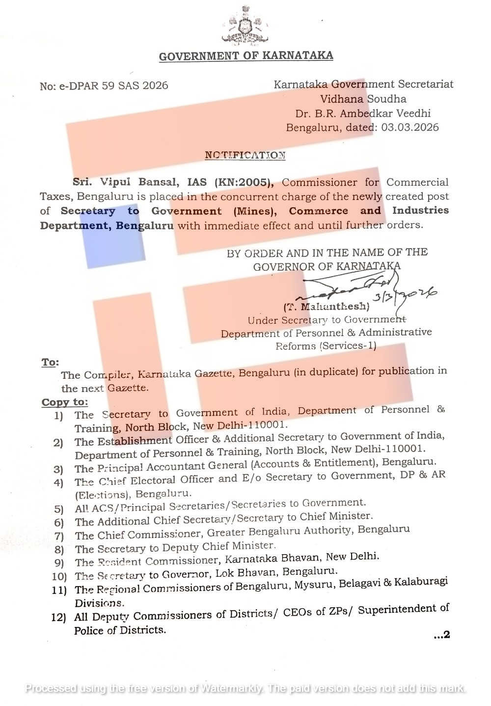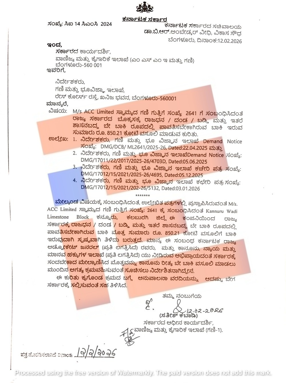 2026ರ ಫೆ.12ರಂದೇ ವಾಣಿಜ್ಯ ಮತ್ತು ಕೈಗಾರಿಕೆ ಇಲಾಖೆಯು ಗಣಿ ಮತ್ತು ಭೂ ವಿಜ್ಞಾನ ಇಲಾಖೆಯ ನಿರ್ದೇಶಕರಿಗೆ ಪತ್ರ ಬರೆದಿದೆ. ಈ ಪತ್ರದ (ಸಂಖ್ಯೆ ಸಿಐ 14 ಸಿಎಂಸಿ 2024, ದಿನಾಂಕ 12.02.2026) ಪ್ರತಿಯು ‘ದಿ ಫೈಲ್’ಗೆ ಲಭ್ಯವಾಗಿದೆ.