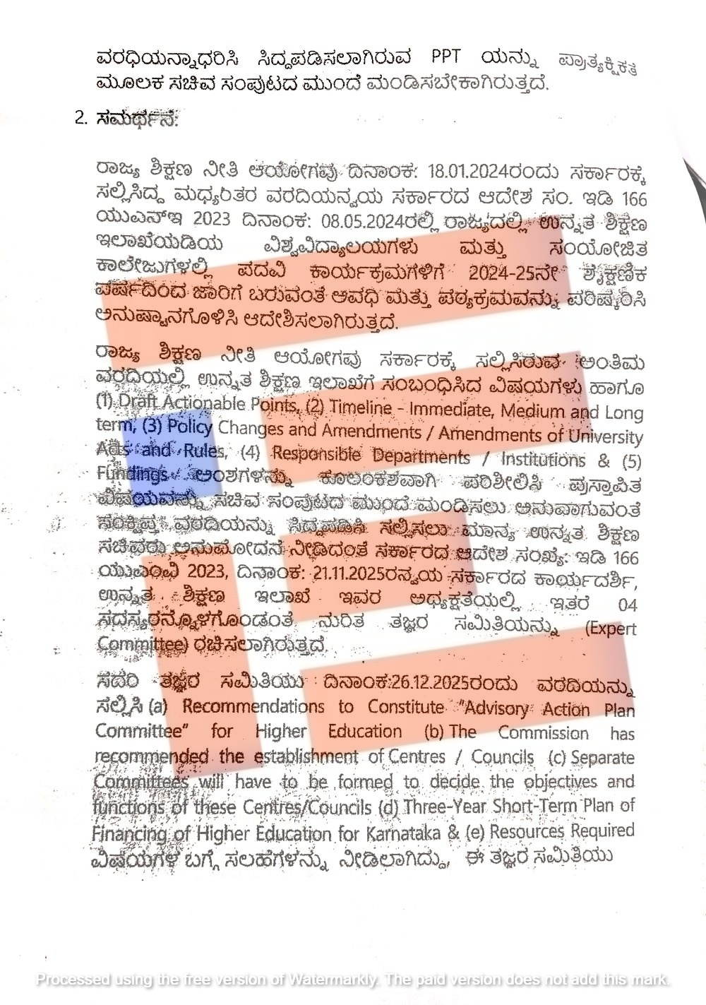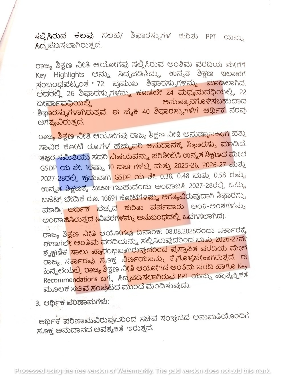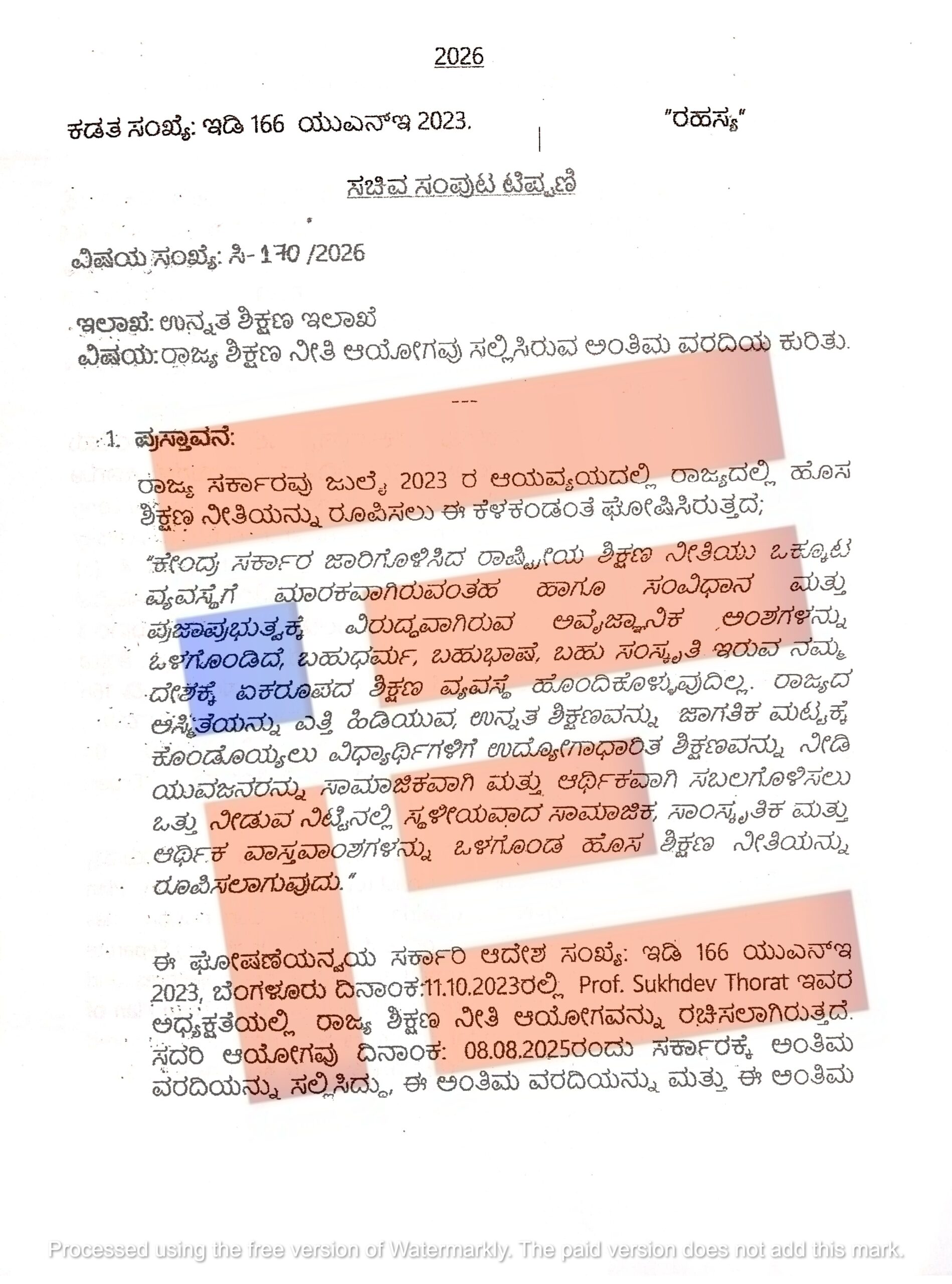 ರಾಜ್ಯ ಶಿಕ್ಷಣ ನೀತಿ ಆಯೋಗವು ಅಂತಿಮ ವರದಿಯಲ್ಲಿ ಮಾಡಿರುವ ಶಿಫಾರಸ್ಸುಗಳನ್ನು ಅನುಷ್ಠಾನಗೊಳಿಸುವ ಸಂಬಂಧ ಉನ್ನತ ಶಿಕ್ಷಣ ಇಲಾಖೆಯು ಸಚಿವ ಸಂಪುಟಕ್ಕೆ ಕಡತ ಮಂಡಿಸಿದೆ. ಸಚಿವ ಸಂಪುಟಕ್ಕೆ ಮಂಡಿಸಿರುವ ಕಡತದ ರಹಸ್ಯ ಹಾಳೆಗಳು ದಿ ಫೈಲ್ ಗೆ ಲಭ್ಯವಾಗಿವೆ.