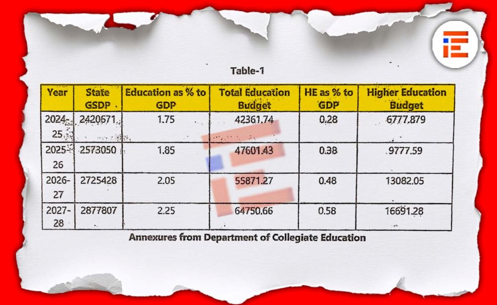 ‘ರಾಜ್ಯ ಶಿಕ್ಷಣ ನೀತಿ ಆಯೋಗವು ರಾಜ್ಯ ಶಿಕ್ಷಣ ನೀತಿ ಅನುಷ್ಠಾನಕ್ಕಾಗಿ ಹತ್ತು ಸಾವಿರ ಕೋಟಿ ರುಪಾಯಿಗಳ ಹೆಚ್ಚುವರಿ ಅನುದಾನಕ್ಕೆ ಶಿಫಾರಸ್ಸು ಮಾಡಿದೆ. ತಜ್ಞರ ಸಮಿತಿಯು ಈ ವಿಷಯವನ್ನು ಪರಿಶೀಲಿಸಿ ಉನ್ನತ ಶಿಕ್ಷಣದ ಮೇಲೆ ಜಿಎಸ್ಡಿಪಿಯ ಶೇ 1ರಷ್ಟು 10 ವರ್ಷಗಳಲ್ಲಿ ಮತ್ತು 2025-26, 2026-27 ಮತ್ತು 2027-28ರಲ್ಲಿ ಕ್ರಮವಾಗಿ ಜಿಎಸ್ಡಿಪಿಯ ಶೆ. 0.38, 0.48 ಮತತು 0.58ರಷ್ಟು ಉನ್ನತ ಶಿಕ್ಷಣಕ್ಕೆ ಖರ್ಚಾಗಬಹುದು ಎಂದು ಅಂದಾಜಿಸಿದೆ. ಅಲ್ಲದೇ 2027-28ರಲ್ಲಿ ಒಟ್ಟು ಬಜೆಟ್ ಬೇಡಿಕೆ 16,691 ಕೋಟಿಗಳಷ್ಟು ಅಗತ್ಯವಿದೆ ಎಂದು ಶಿಫಾರಸ್ಸು ಮಾಡಿದೆ.,’ ಎಂದು ಟಿಪ್ಪಣಿಯಲ್ಲಿ ವಿವರಿಸಿದೆ.