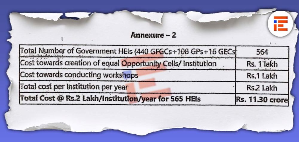 ಕಾಲೇಜು ಶಿಕ್ಷಣ ಇಲಾಖೆಯಡಿಯಲ್ಲಿ ಸ್ನಾತಕೋತ್ತರ ತರಗತಿಗಳ ಪ್ರತೀ ವರ್ಷ ತರಬೇತಿಗೆ 10,000 ರು ವೆಚ್ಚದಂತೆ ಒಟ್ಟಾರೆ 60,00,000 ರು ವೆಚ್ಚವಾಗಲಿದೆ. ಕಾರ್ಯಾಗಾರಗಳನ್ನು ನಡೆಸಲು ಶಿಕ್ಷಣ ಸಂಸ್ಥೆಗೆ ವರ್ಷವೊಂದಕ್ಕೆ 2 ಲಕ್ಷ ರು, ಸಮಾನ ಅವಕಾಶಗಳ ಕೋಶ ರಚಿಸಲು 1 ಲಕ್ಷ ರು ನಂತೆ 11.30 ಕೋಟಿ ರು ವೆಚ್ದ ಭರಿಸಬೇಕಿದೆ.