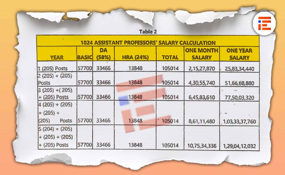 ಅದೇ ರೀತಿ 1,024 ಸಹಾಯಕ ಪ್ರಾಧ್ಯಾಪಕರ ವೇತನದ ವೆಚ್ಚದ ಕುರಿತೂ ಉನ್ನತ ಶಿಕ್ಷಣ ಇಲಾಖೆಯು ಮಾಹಿತಿ ಒದಗಿಸಿದೆ. ಮೊದಲ ವರ್ಷದಲ್ಲಿ 205 ಹುದ್ದೆಗಳಿಗೆ ನೇಮಕವಾಗುವ ಸಹಾಯಕ ಪ್ರಾಧ್ಯಾಪಕರಿಗೆ ಮೂಲ ವೇತನ 57,700 ರು., ಡಿ ಎ 33,466 ರು, ಎಚ್ ಆರ್ ಎ 13,848, ಸೇರಿ ಒಟ್ಟಾರೆ 1,05,014 ರು ನಂತೆ ಒಂದು ತಿಂಗಳ ವೇತನಕ್ಕೆ 2,15,27,870 ರು ವೆಚ್ಚವಾಗಲಿದೆ.