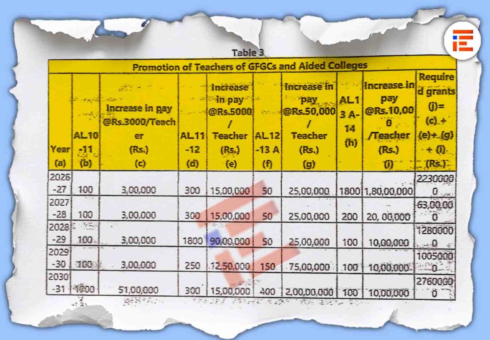 ಸರ್ಕಾರಿ ಮತ್ತು ಅನುದಾನಿತ ಸರ್ಕಾರಿ ಪ್ರಥಮದರ್ಜೆ ಕಾಲೇಜುಗಳ ಬೋಧಕರಿಗೆ ಬಡ್ತಿ ನೀಡಲು ಹೆಚ್ಚುವರಿ ಅನುದಾನ ಬೇಕಿದೆ. 2026-27ರಿಂದ 2030-31ರವರೆಗೆ ಪ್ರತಿ ತಿಂಗಳು 3,000 ರು ನಂತೆ ವೇತನ ಹೆಚ್ಚಳದೊಂದಿಗೆ ಒಟ್ಟಾರೆ 79,050,000 ರು ಅನುದಾನ ಬೇಕಿದೆ ಎಂದು ಅಂದಾಜಿಸಿದೆ.