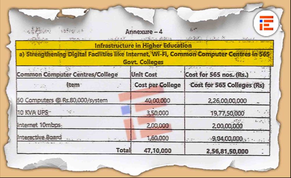 10ಕೆವಿ ಸಾಮರ್ಥ್ಯದ ಯುಪಿಎಸ್ಗೆ ಕಾಲೇಜುವೊಂದಕ್ಕೆ 3,50,000 ರು., 565 ಕಾಲೇಜುಗಳಿಗೆ 19,77,50,000 ರು, ಇಂಟರ್ನೆಟ್ (10 ಎಂಬಿಪಿಎಸ್) 2,00,000 ರುನಂತೆ 565 ಕಾಲೇಜುಗಳಿಗೆ 2,00,00,000 ರು., ಇಂಟರ್ಯಾಕ್ವೀವ್ ಬೋರ್ಡ್ 1,60,000 ರು ನಂತೆ 565 ಕಾಲೇಜುಗಳಿಗೆ 9,04,00,000 ರು ಸೇರಿ ಒಟ್ಟಾರೆ 2,56,81,50,000 ರು ಅನುದಾನದ ಅವಶ್ಯಕತೆ ಇದೆ ಎಂದು ವಿವರಿಸಿದೆ.