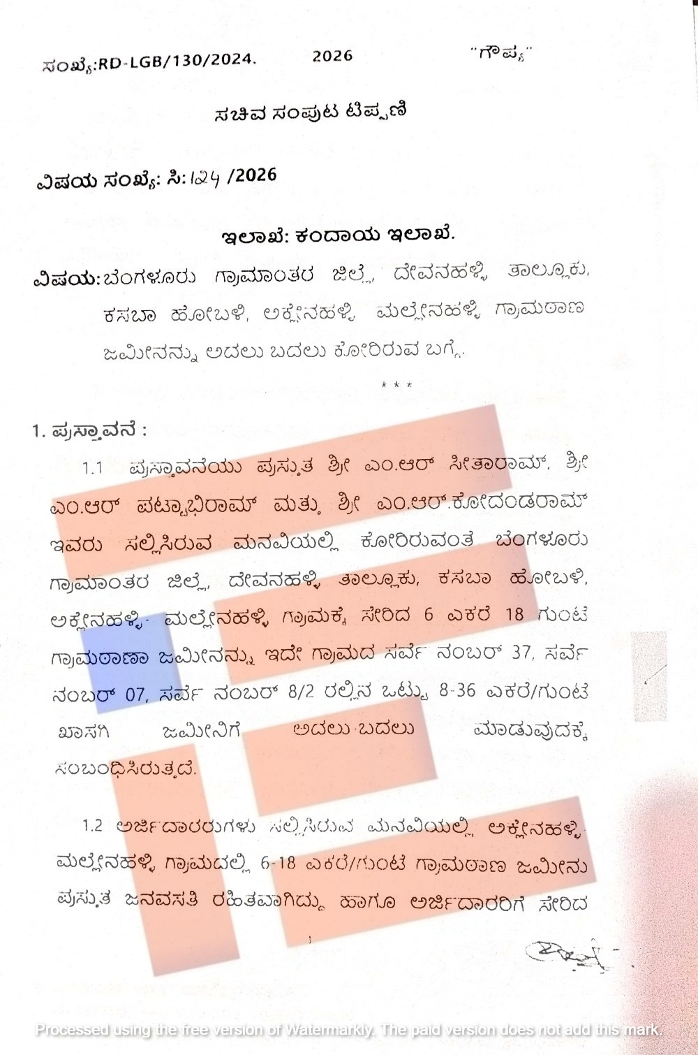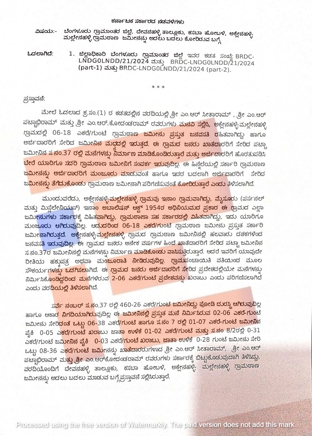 ಬೆಂಗಳೂರು ಗ್ರಾಮಾಂತರ ಜಿಲ್ಲೆ ದೇವನಹಳ್ಳಿ ತಾಲೂಕಿನ ಕಸಬಾ ಹೋಬಳಿಯ ಅಕ್ಲೇನಹಳ್ಳಿ ಮಲ್ಲೇನಹಳ್ಳಿ ಗ್ರಾಮಕ್ಕೆ ಸೇರಿದ 6 ಎಕರೆ 18 ಗುಂಟೆ ಗ್ರಾಮ ಠಾಣೆ ಜಮೀನನ್ನು ಇದೇ ಗ್ರಾಮದ ಸರ್ವೆ ನಂಬರ್ 37, 07, 8/2ರಲ್ಲಿನ ಒಟ್ಟು 8 ಎಕರೆ 36 ಗುಂಟೆ ಖಾಸಗಿ ಜಮೀನಿಗೆ ಅದಲು ಮಾಡಿಕೊಡಬೇಕು ಎಂದು ವಿಧಾನ ಪರಿಷತ್ ಸದಸ್ಯ ಎಂ ಆರ್ ಸೀತಾರಾಂ, ಎಂ ಆರ್ ಪಟ್ಟಾಭಿರಾಮ್ ಮತ್ತು ಎಂ ಆರ್ ಕೋದಂಡರಾಮ್ ಅವರು ಮನವಿ ಸಲ್ಲಿಸಿದ್ದರು. ಇದೇ ಮನವಿಯನ್ನು ಪುರಸ್ಕರಿಸಿದ್ದ ಕಂದಾಯ ಇಲಾಖೆಯು ಸಚಿವ ಸಂಪುಟದ ಪ್ರಸ್ತಾವನೆಯಲ್ಲಿಯೂ ಸೇರಿಸಿತ್ತು.
