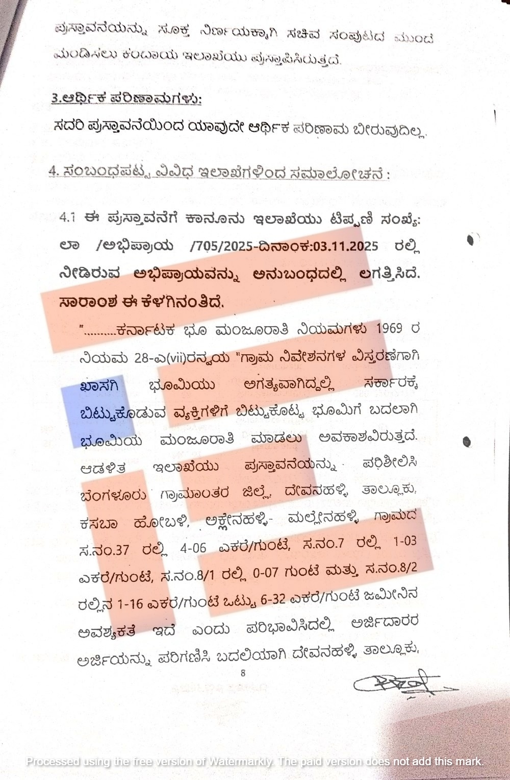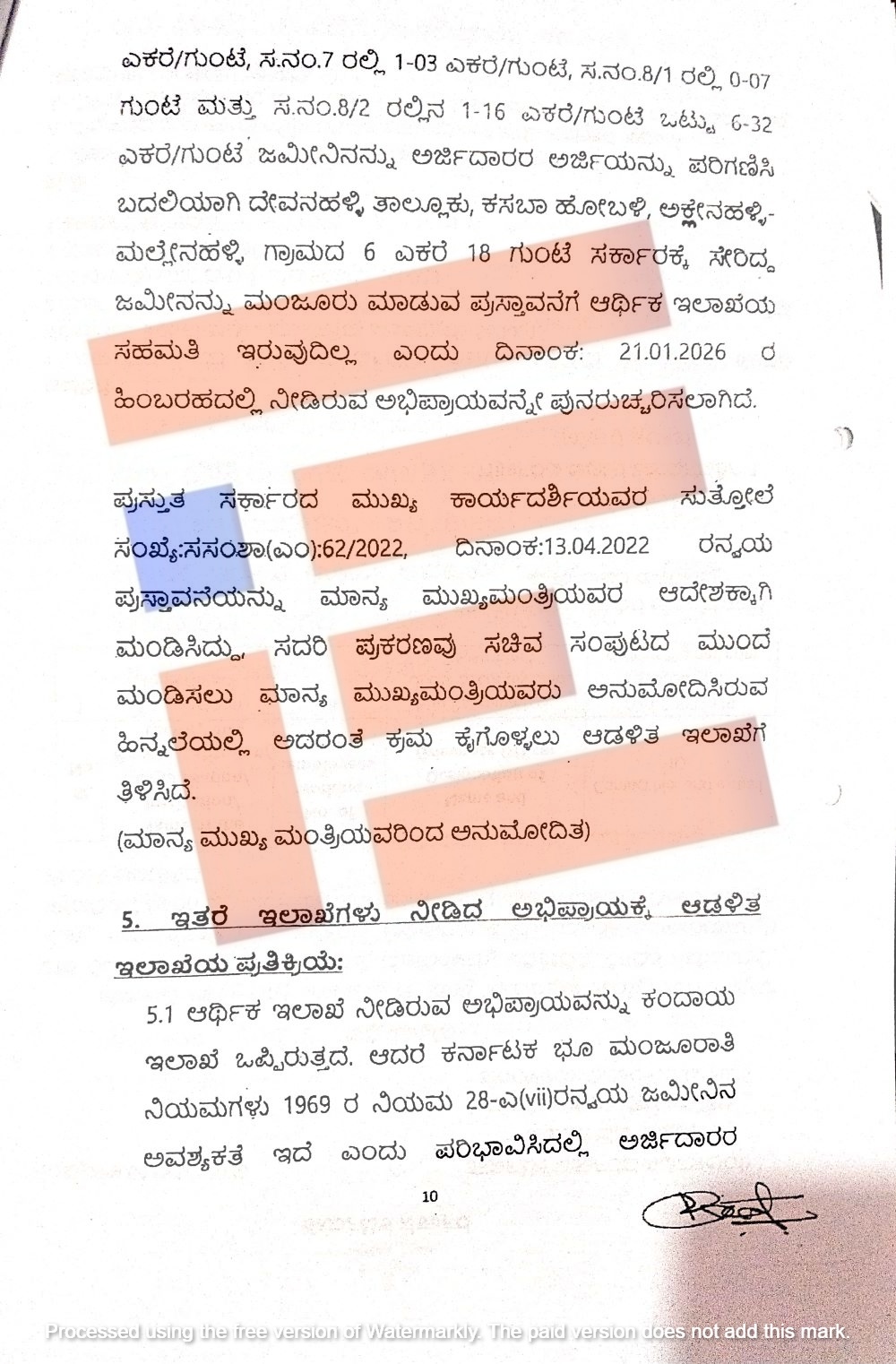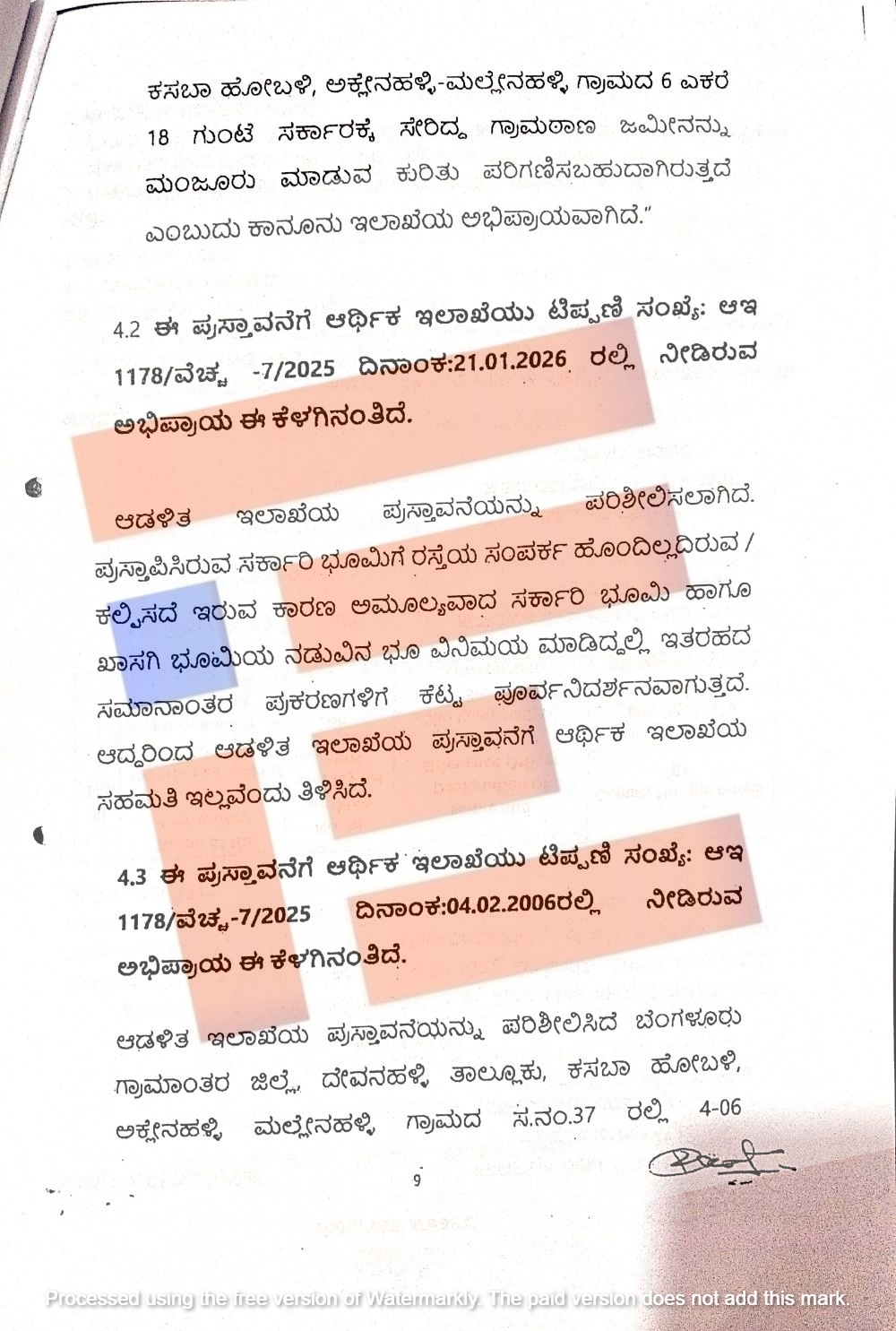 ಕಂದಾಯ ಇಲಾಖೆಯು ಪ್ರಸ್ತಾಪಿಸಿರುವ ಸರ್ಕಾರಿ ಭೂಮಿಗೆ ರಸ್ತೆಯ ಸಂಪರ್ಕ ಹೊಂದಿದಲ್ಲದಿರುವ, ಕಲ್ಪಿಸದೇ ಇರುವ ಕಾರಣ ಅಮೂಲ್ಯವಾದ ಸರ್ಕಾರಿ ಭೂಮಿ ಹಾಗೂ ಖಾಸಗಿ ಭೂಮಿ ನಡುವಿನ ಭೂ ವಿನಿಮಯ ಮಾಡಿದಲ್ಲಿ ಈ ತರಹದ ಸಮಾನಾಂತರ ಪ್ರಕರಣಗಳಿಗೆ ಕೆಟ್ಟ ಪೂರ್ವ ನಿದರ್ಶನವಾಗಲಿದೆ. ಅಧ್ದರಿಂದ ಆಡಳಿತ ಇಲಾಖೆಯ ಪ್ರಸ್ತಾವನೆಗೆ ಆರ್ಥಿಕ ಇಲಾಖೆಯ ಸಹಮತಿ ಇಲ್ಲ ಎಂದು 2026ರ ಜನವರಿ 21ರಂದೇ ತನ್ನ ಅಭಿಪ್ರಾಯ ತಿಳಿಸಿತ್ತು.