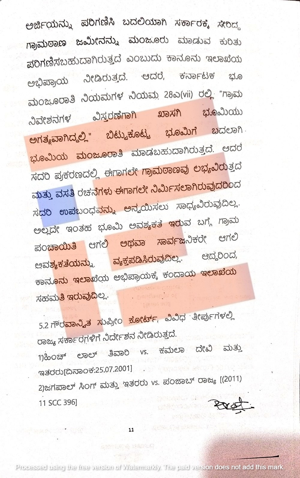 ಆದರೆ ಕರ್ನಾಟಕ ಮಂಜೂರಾತಿ ನಿಯಮಗಳ ನಿಯಮ 28 ಎ (vii) ಗ್ರಾಮ ನಿವೇಶನಗಳ ವಿಸ್ತರಣೆಗಾಗಿ ಖಾಸಗಿ ಭೂಮಿಯು ಅವಶ್ಯಕತೆವಾಗಿದ್ದಲ್ಲಿ ಬಿಟ್ಟುಕೊಟ್ಟ ಭೂಮಿಗೆ ಬದಲಾಗಿ ಭೂಮಿಯ ಮಂಜೂರಾತಿ ಮಾಡಬಹುದು. ಆದರೆ ಈ ಪ್ರಕರಣದಲ್ಲಿ ಗ್ರಾಮ ಠಾಣವು ಲಭ್ಯವಿದೆ. ಮತ್ತು ವಸತಿ ರಚನೆಗಳು ಈಗಾಗಲೇ ನಿರ್ಮಾಣಗೊಂಡಿವೆ. ಹೀಗಾಗಿ ಉಪ ಬಂಧವನ್ನು ಅನ್ವಯಿಸಲು ಸಾಧ್ಯವಿಲ್ಲ. ಅಲ್ಲದೇ ಇಂತಹ ಭೂಮಿ ಅವಶ್ಯಕತೆ ಇರುವ ಬಗ್ಗೆ ಗ್ರಾಮ ಪಂಚಾಯ್ತಿ ಆಗಲೀ ಅಥವಾ ಸಾರ್ವಜನಿಕರೇ ಆಗಲಿ ಅವಶ್ಯಕತೆಯನ್ನು ವ್ಯಕ್ತಪಡಿಸಿಲ್ಲ. ಹೀಗಾಗಿ ಕಾನೂನು ಇಲಾಖೆಯ ಅಭಿಪ್ರಾಯಕ್ಕೆ ಕಂದಾಯ ಇಲಾಖೆಯು ಸಹಮತಿ ವ್ಯಕ್ತಪಡಿಸಿರಲಿಲ್ಲ.