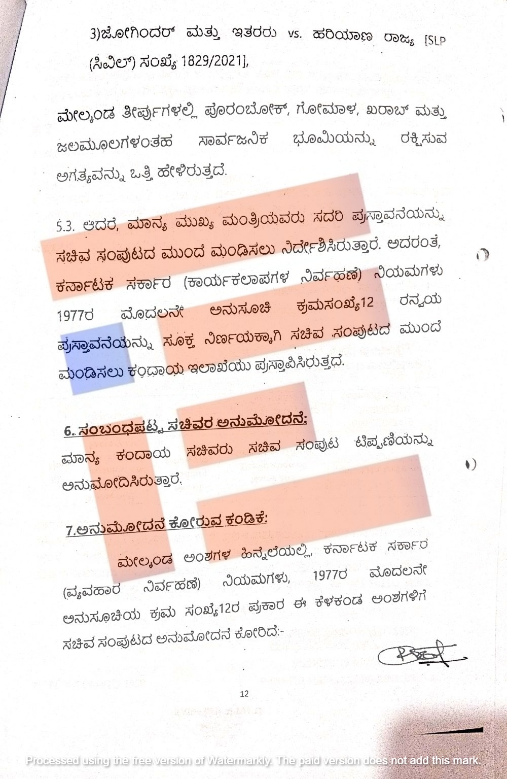 ಈ ಪ್ರಕರಣದಲ್ಲಿ ಕಾನೂನು ತೊಡಕುಗಳಿದ್ದರೂ ಸಹ ಮುಖ್ಯಮಂತ್ರಿ ಸಿದ್ದರಾಮಯ್ಯ ಅವರು ಸಚಿವ ಸಂಪುಟದ ಮುಂದೆ ಮಂಡಿಸಲು ಕಂದಾಯ ಇಲಾಖೆಗೆ ನಿರ್ದೇಶನ ನೀಡಿದ್ದರು. ಅದರಂತೆ ಕಂದಾಯ ಇಲಾಖೆಯು ಕಡತ ಮಂಡಿಸಿತ್ತು.