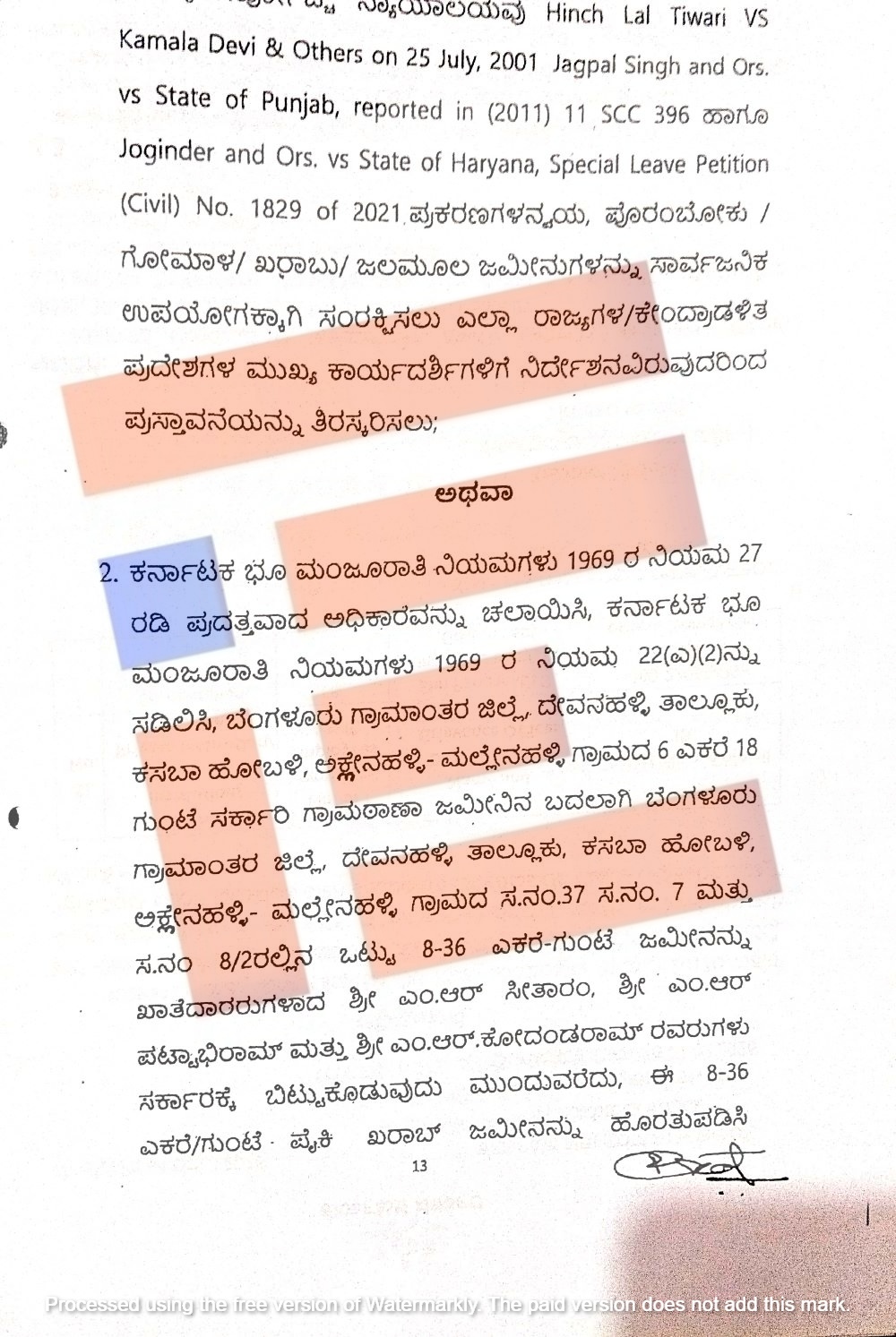 ಕರ್ನಾಟಕ ಭೂ ಮಂಜೂರಾತಿ ನಿಯಮಗಳು 1969ರ ನಿಯಮ 27ರ ಅಡಿ ಇರುವ ಅಧಿಕಾರವನ್ನು ಚಲಾಯಿಸುವುದು ಮತ್ತು 1969ರ ನಿಯಮ 22 (ಎ) (2)ನ್ನು ಸಡಿಲಿಸಬಹುದು ಎಂದು ಮತ್ತೊಂದು ಆಯ್ಕೆಯನ್ನು ನೀಡಿತ್ತು. ಎಂ ಆರ್ ಸೀತಾರಾಂ, ಎಂ ಆರ್ ಪಟ್ಟಾಭಿರಾಮ್, ಎಂ ಆರ್ ಕೋದಂಡರಾಮ್ ಅವರು ಸರ್ಕಾರಕ್ಕೆ 8 ಎಕರೆ 36 ಗುಂಟೆ ಜಮೀನನ್ನು ಬಿಟ್ಟುಕೊಡಲು ಒಪ್ಪಿದ್ದಾರೆ. ಈ 8 ಎಕರೆ 36 ಗುಂಟೆ ಪೈಕಿ ಖರಾಬ್ ಜಮೀನನ್ನು ಹೊರತುಪಡಿಸಿ ನೋಂದಾಯಿತ ಪರಿತ್ಯಾಜನಾ ಪ್ರಮಾಣ ಪತ್ರ ನೀಡುವುದು ಮತ್ತು ಸರ್ವೇ ಪೋಡಿ ಕಾರ್ಯಗತಗೊಳಿಸಬೇಕು. ಮತ್ತು ಶಾಸನಬದ್ಧ ನಿಬಂಧನೆಗಳ ಪಾಲನೆಯ ಷರತ್ತುಗಳಿಗೆ ಒಳಪಟ್ಟು ಅದಲು ಬದಲು ಮಾಡಬಹುದು ಎಂದು 2ನೇ ಆಯ್ಕೆಯ ಕುರಿತು ವಿವರಿಸಿತ್ತು.