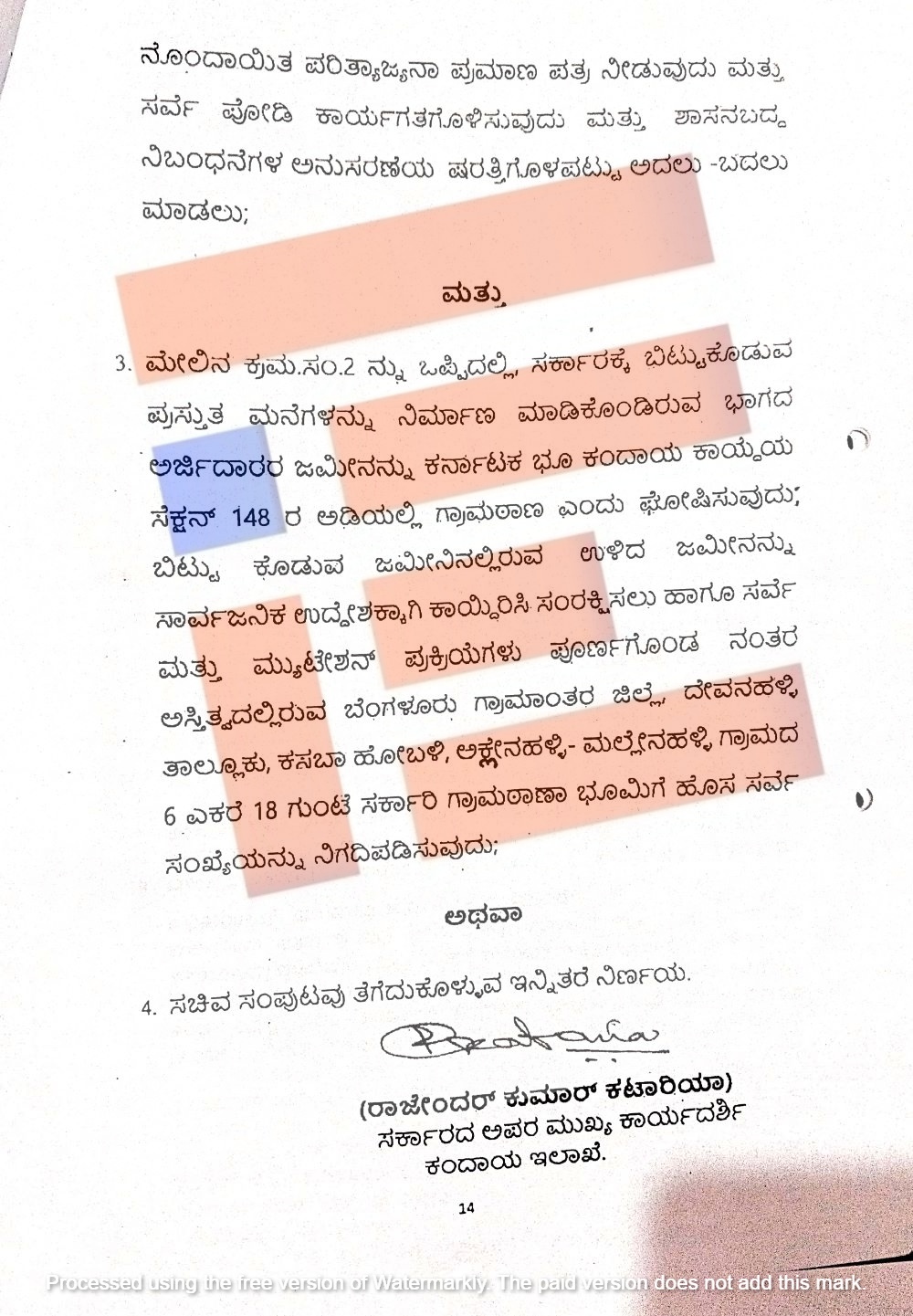 ಮೂರನೇ ಆಯ್ಕೆಯ ಪ್ರಕಾರ ಅರ್ಜಿದಾರರು ಬಿಟ್ಟುಕೊಡುವ ಜಮೀನಿನಲ್ಲಿರುವ ಉಳಿದ ಜಮೀನನ್ನು ಸಾರ್ವಜನಿಕ ಉದ್ದೇಶಕ್ಕಾಗಿ ಕಾಯ್ದಿರಿಸಿ ಸಂರಕ್ಷಿಸಲು ಸರ್ವೇ ಮತ್ತು ಮ್ಯುಟೇಷನ್ ಪ್ರಕ್ರಿಯೆಗಳು ಪೂರ್ಣಗೊಳ್ಳಬೇಕು. ನಂತರ ಅಸ್ತಿತ್ವದಲ್ಲಿರುವ ಬೆಂಗಳೂರು ಗ್ರಾಮಾಂತರ ಜಿಲ್ಲೆ ದೇವನಹಳ್ಳಿ ತಾಲೂಕು ಕಸಬಾ ಹೋಬಳಿಯ ಅಕ್ಲೇನಹಳ್ಳಿ, ಮಲ್ಲೇನಹಳ್ಳಿ ಗ್ರಾಮದ 6 ಎಕರೆ 18 ಗುಂಟೆ ವಿಸ್ತೀರ್ಣದ ಸರ್ಕಾರಿ ಗ್ರಾಮ ಠಾಣೆ ಭೂಮಿಗೆ ಹೊಸ ಸರ್ವೇ ಸಂಖ್ಯೆ ನಿಗದಿಪಡಿಸಬಹುದು ಎಂದು ವಿವರಿಸಿತ್ತು.