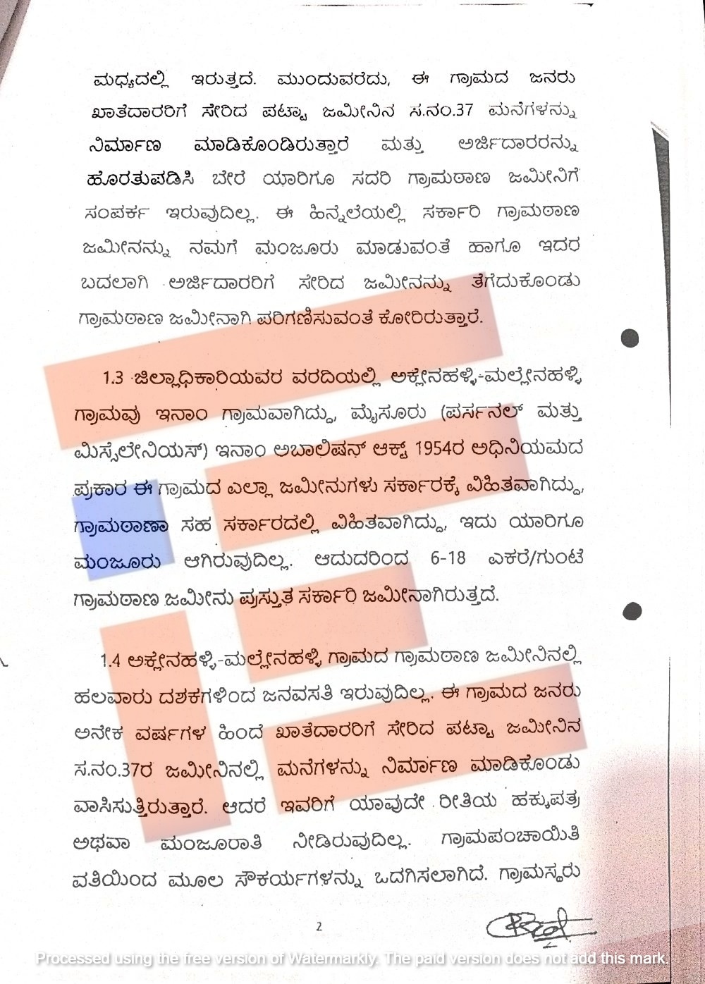 ಈ ಗ್ರಾಮ ಠಾಣಾ ಜಮೀನಿನಲ್ಲಿ ಹಲವು ದಶಕಗಳಿಂದ ಜನವಸತಿ ಇಲ್ಲ. ಈ ಗ್ರಾಮದ ಜನರು ಅನೇಕ ವರ್ಷಗಳ ಹಿಂದೆ ಖಾತೆದಾರರಿಗೆ ಸೇರಿದ ಪಟ್ಟಾ ಜಮೀನಿನ ಸರ್ವೆ ನಂಬರ್ 37ರಲ್ಲಿನ ಮನೆಗಳನ್ನು ನಿರ್ಮಾಣ ಮಾಡಿಕೊಂಡು ವಾಸಿಸುತ್ತಿದ್ದಾರೆ. ಆದರೆ ಇವರಿಗೆ ಯಾವುದೇ ರೀತಿಯ ಹಕ್ಕುಪೊತ್ರ ಅಥವಾ ಮಂಜೂರಾತಿ ನೀಡಿಲ್ಲ. ಗ್ರಾಮ ಪಂಚಾಯ್ತಿಯಿಂದ ಮೂಲಸೌಕರ್ಯಗಳನ್ನೂ ಒದಗಿಸಲಾಗಿದೆ. ಗ್ರಾಮಸ್ಥರು ಅರ್ಜಿದಾರರಿಗೆ ಸೇರಿದ ಪ್ರದೇಶದಲ್ಲಿಯೇ ಮನೆಗಳನ್ನು ನಿರ್ಮಾಣ ಮಾಡಿಕೊಂಡಿದ್ದಾರೆ. ಮನೆಗಳಿರುವ 2 ಎಕರೆ 6 ಗುಂಟೆ ಪ್ರದೇಶವನ್ನು ಖರಾಬು ಎಂದು ಪರಿಗಣಿಸಲಾಗಿದೆ ಎಂದು ಜಿಲ್ಲಾಧಿಕಾರಿ ಅವರು ವರದಿಯಲ್ಲಿ ವಿವರಿಸಿದ್ದರು.
