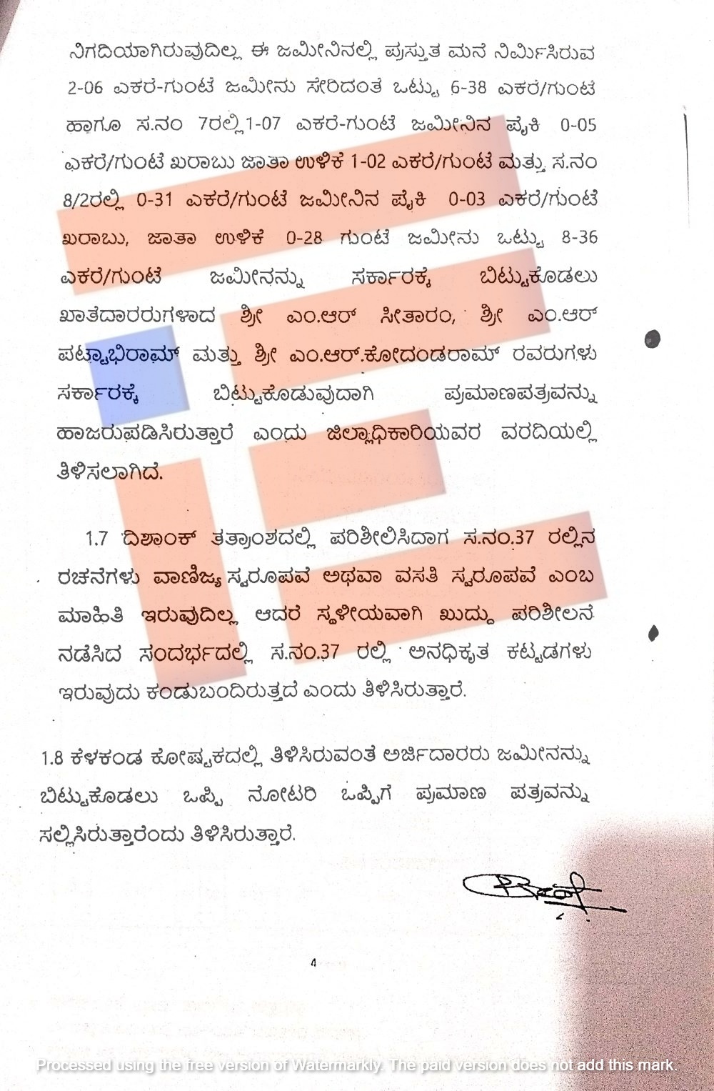 ಸರ್ವೆ ನಂಬರ್ 37ರಲ್ಲಿ ಒಟ್ಟು 12 ಎಕರೆ ಇದೆ. ಈ ಪೈಕಿ ಎಂ ಆರ್ ಸೀತಾರಾಮ್ ಅವರ ಹೆಸರಿನಲ್ಲಿ 8 ಎಕರೆ ಮತ್ತು ಎಂ ಆರ್ ಪಟ್ಟಾಭಿರಾಮ್ ಅವರ ಹೆಸರಿನಲ್ಲಿ 4 ಎಕರೆ ಇದೆ. ಸರ್ವೆ ನಂಬರ್ 37ರಲ್ಲಿ ಒಟ್ಟಾರೆ 460 ಎಕರೆ 26 ಗುಂಟೆ ಇದೆ. ಆದರೆ ಪೋಡಿ ದುರಸ್ತಿ ಆಗಿಲ್ಲ. ಹಾಗೂ ಆಕಾರ್ ಬಂದ್ ಕೂಡ ನಿಗದಿಯಾಗಿಲ್ಲ.