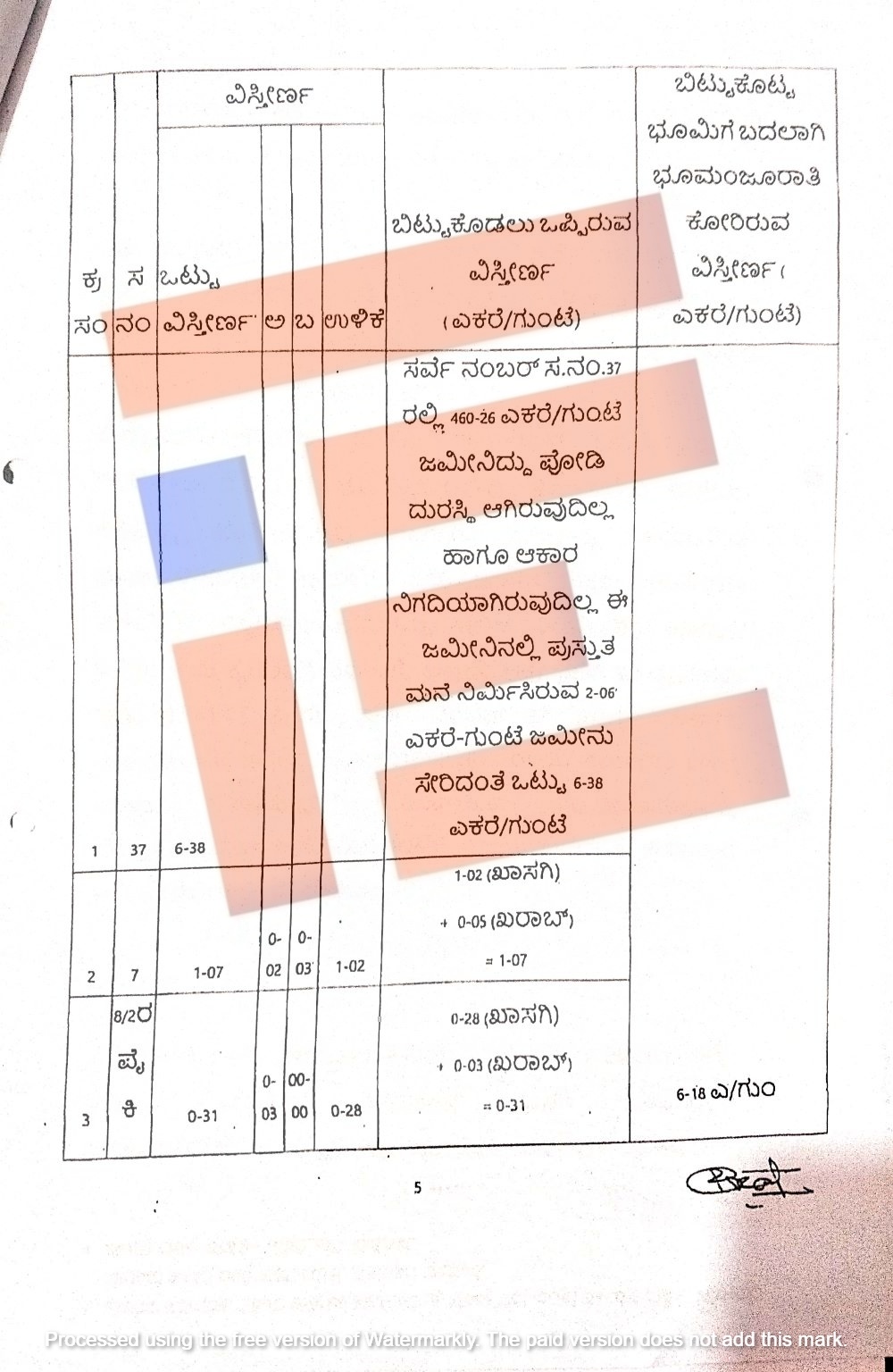 ಈ ಜಮೀನಿನಲ್ಲಿ ಪ್ರಸ್ತುತ ಮನೆ ನಿರ್ಮಿಸಿರುವ 2 ಎಕರೆ 6 ಗುಂಟೆ ಜಮೀನು ಸೇರಿದಂತೆ ಒಟ್ಟಾರೆ 6 ಎಕರೆ 38 ಗುಂಟೆ ಹಾಗೂ ಸರ್ವೇ ನಂಬರ್ 7ರಲ್ಲಿ 1 ಎಕರೆ 7 ಗುಂಟೆ ಜಮೀನಿನ ಪೈಕಿ 0-05 ಗುಂಟೆ ಖರಾಬು, ಜಾತಾ ಉಳಿಕೆ ಹೆಸರಿನಲ್ಲಿ 1 ಎಕರೆ 02 ಗುಂಟೆ ಮತ್ತು ಸರ್ವೆ ನಂಬರ್ 8/2ರಲ್ಲಿನ 0-31 ಗುಂಟೆ ಜಮೀನಿನ ಪೈಕಿ 0-03 ಎಕರೆ ಖರಾಬು, ಜಾತಾ ಉಳಿಕೆ ಹೆಸರಿನಲ್ಲಿ 0-28 ಗುಂಟೆ ಸೇರಿ ಒಟ್ಟಾರೆ 8 ಎಕರೆ 36 ಗುಂಟೆ ಜಮೀನನ್ನು ಸರ್ಕಾರಕ್ಕೆ ಬಿಟ್ಟುಕೊಡಲು ಪ್ರಮಾಣ ಪತ್ರವನ್ನು ಹಾಜರುಪಡಿಸಿದ್ದರು ಎಂಬುದು ಸಚಿವ ಸಂಪುಟ ಟಿಪ್ಪಣಿ ಹಾಳೆಗಳಿಂದ ಗೊತ್ತಾಗಿದೆ.