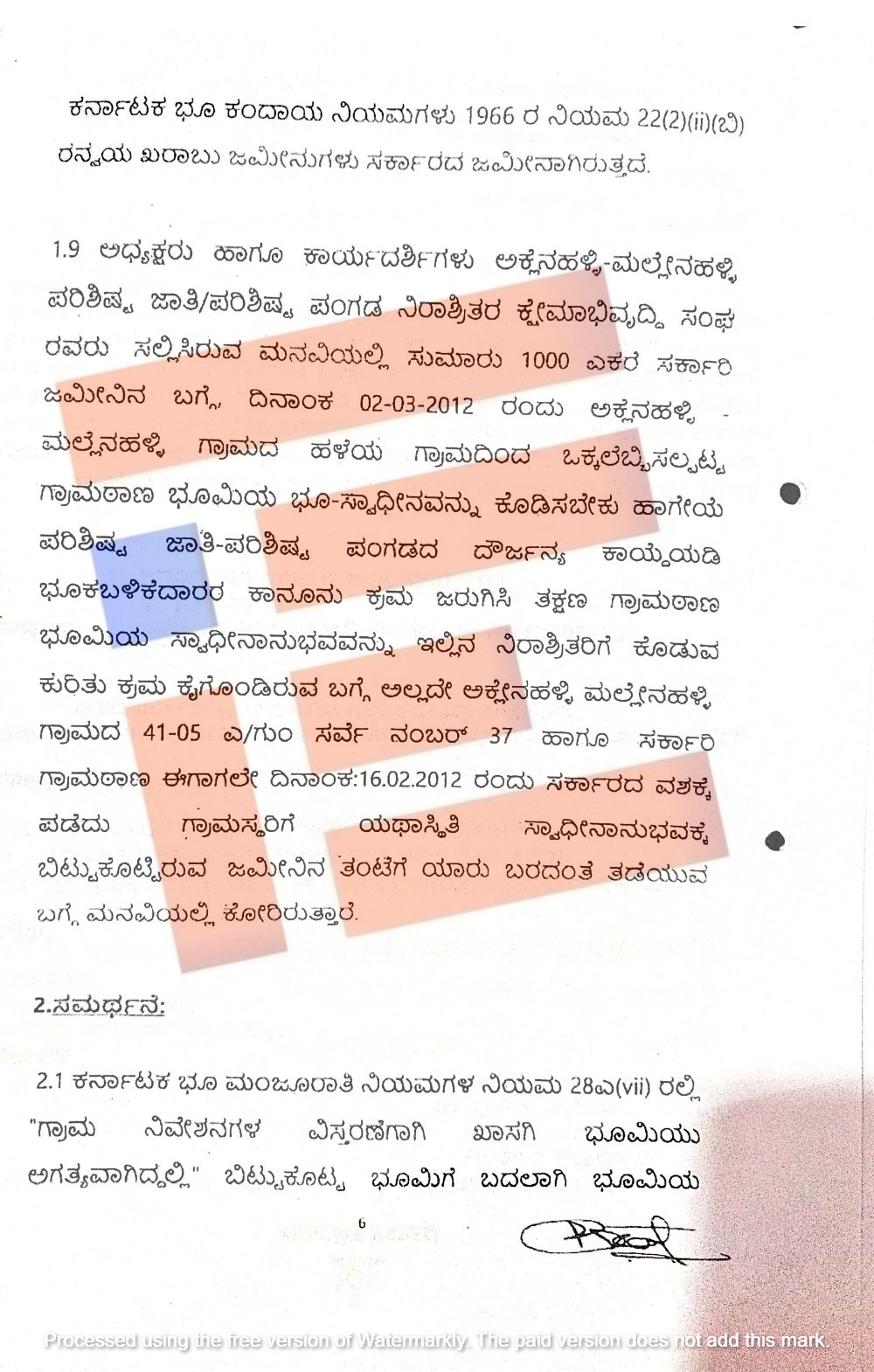 ಅಕ್ಲೇನಹಳ್ಳಿ ಮತ್ತು ಮಲ್ಲೇನಹಳ್ಳಿಯಲ್ಲಿನ ಪರಿಶಿಷ್ಟ ಜಾತಿ ಮತ್ತು ಪರಿಶಿಷ್ಟ ಪಂಗಡದ ನಿರಾಶ್ರಿತರ ಕ್ಷೇಮಾಭಿವೃದ್ಧಿ ಸಂಘವು ಮನವಿ ಸಲ್ಲಿಸಿತ್ತು. ಸುಮಾರು 1,000 ಎಕರೆ ಸರ್ಕಾರಿ ಜಮೀನಿನ ಬಗ್ಗೆ ಮನವಿಯಲ್ಲಿ ವಿವರಿಸಿತ್ತು.