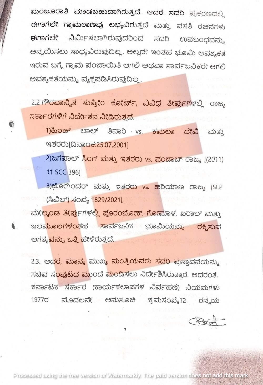 ಹಿಂಚ್ಲಾಲ್ ತಿವಾರಿ, ಜಗಪಾಲ್ ಸಿಂಗ್, ಜೋಗಿಂದರ್ ಪ್ರಕರಣದಲ್ಲಿ ಸುಪ್ರೀಂ ಕೋರ್ಟ್ ನೀಡಿರುವ ತೀರ್ಪಿನ ಪ್ರಕಾರ ಪೊರಂಬೋಕು, ಗೋಮಾಳ, ಖರಾಬು, ಜಲಮೂಲ ಜಮೀನುಗಳನ್ನು ಸಾರ್ವಜನಿಕ ಉಪಯೋಗಕ್ಕಾಗಿ ಸಂರಕ್ಷಿಸಬೇಕು ಎಂದು ಎಲ್ಲಾ ರಾಜ್ಯಗಳು ಮತ್ತು ಕೇಂದ್ರಾಡಳಿತ ಪ್ರದೇಶಗಳ ಮುಖ್ಯ ಕಾರ್ಯದರ್ಶಿಗಳಿಗೆ ನಿರ್ದೇಶನವಿದೆ. ಹೀಗಾಗಿ ಈ ಪ್ರಸ್ತಾವನೆಯನ್ನು ತಿರಸ್ಕರಿಸಬಹುದು ಎಂದು ಮೊದಲ ಆಯ್ಕೆಯನ್ನು ಕಂದಾಯ ಇಲಾಖೆಯು ತೋರಿಸಿತ್ತು.