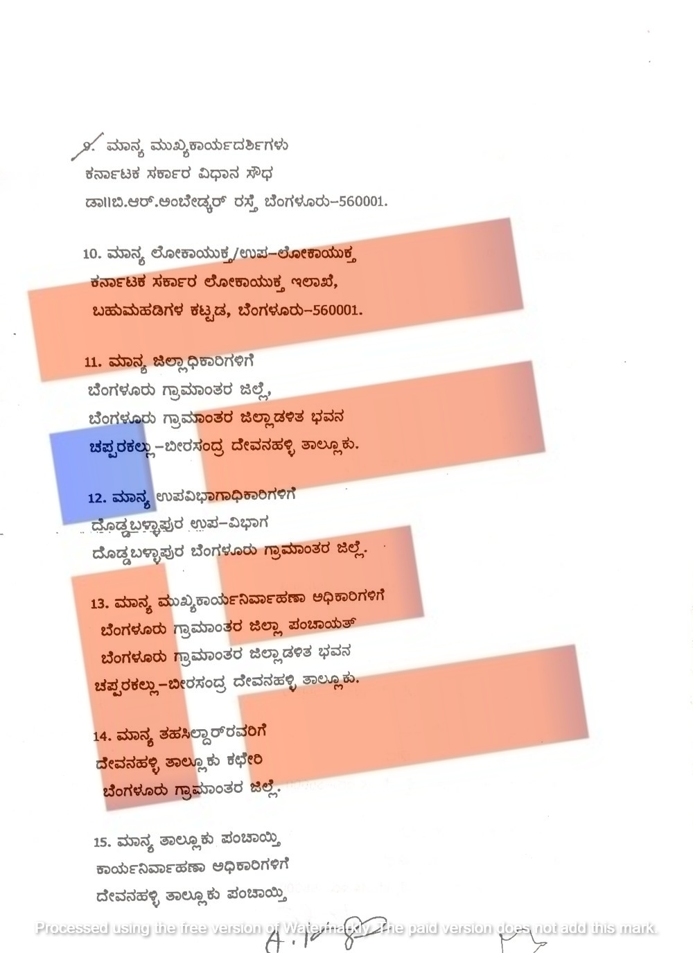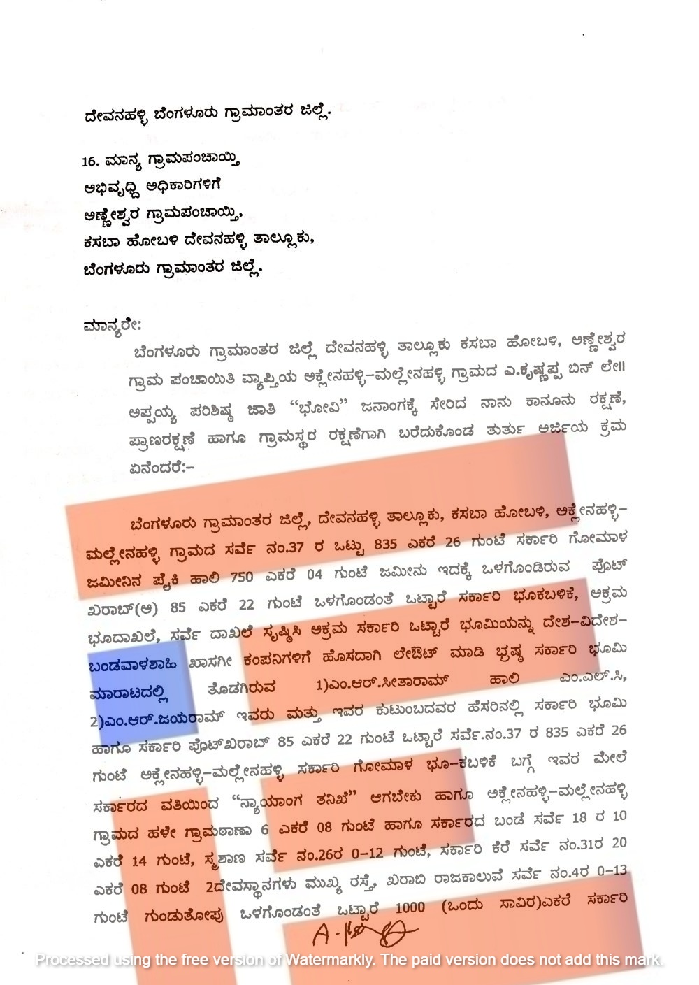 ಬೆಂಗಳೂರು ಗ್ರಾಮಾಂತರ ಜಿಲ್ಲಾಧಿಕಾರಿ, ದೊಡ್ಡಬಳ್ಳಾಪುರ ಉಪ ವಿಭಾಗಾಧಿಕಾರಿ, ಬೆಂಗಳೂರು ಗ್ರಾಮಾಂತರ ಜಿಲ್ಲಾ ಪಂಚಾಯತ್‌ನ ಮುಖ್ಯ ಕಾರ್ಯನಿರ್ವಾಹಕ ಅಧಿಕಾರಿ, ದೇವನಹಳ್ಳಿ ತಹಶೀಲ್ದಾರ್, ದೇವನಹಳ್ಳಿ ತಾಲೂಕು ಪಂಚಾಯ್ತಿ ಕಾರ್ಯನಿರ್ವಾಹಕ ಅಧಿಕಾರಿಗೆ ದೂರನ್ನು ಸಲ್ಲಿಸಿದ್ದರು.